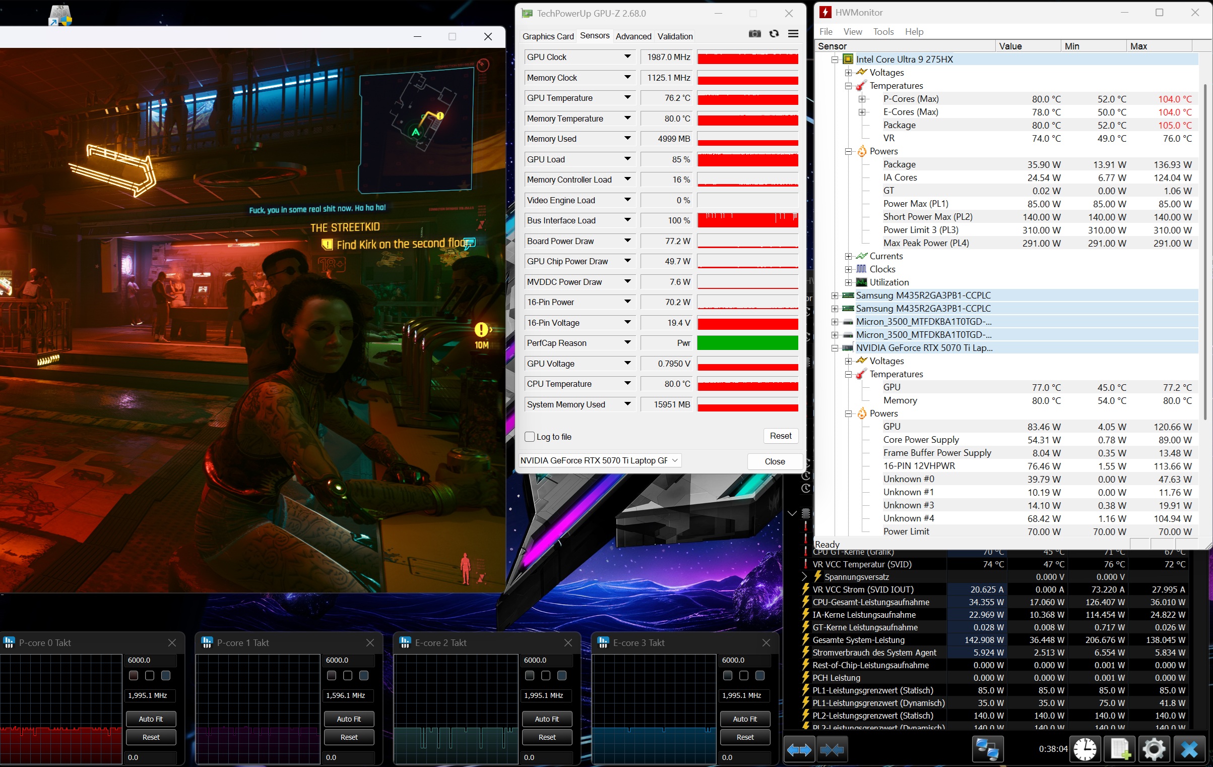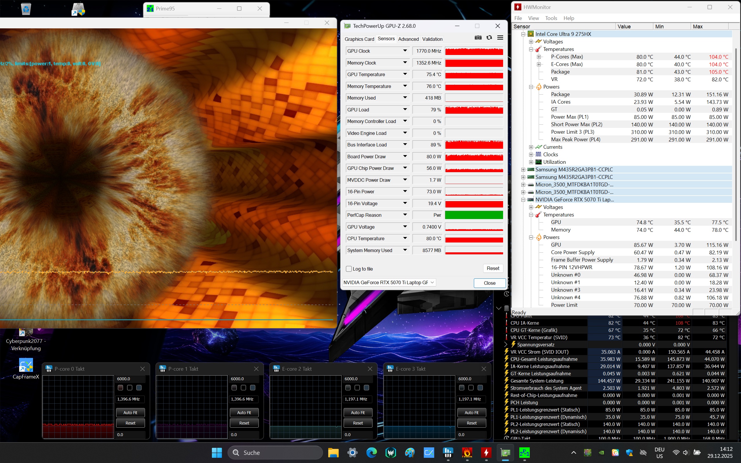 In de stresstest met de programma's Furmark en Prime95 werkte vooral de CPU zich behoorlijk in het zweet. Na kortstondig de 100 °C te hebben overschreden, zakte de temperatuur naar een acceptabele 80 °C. De GPU bleef ondertussen steken rond de 75 °C.