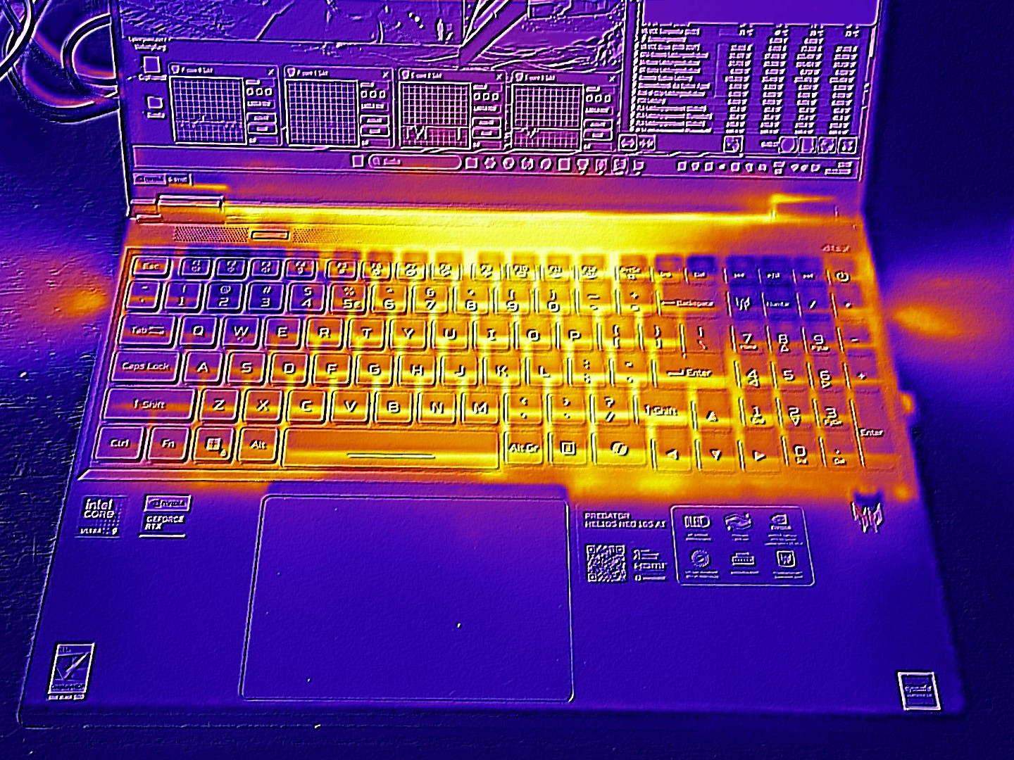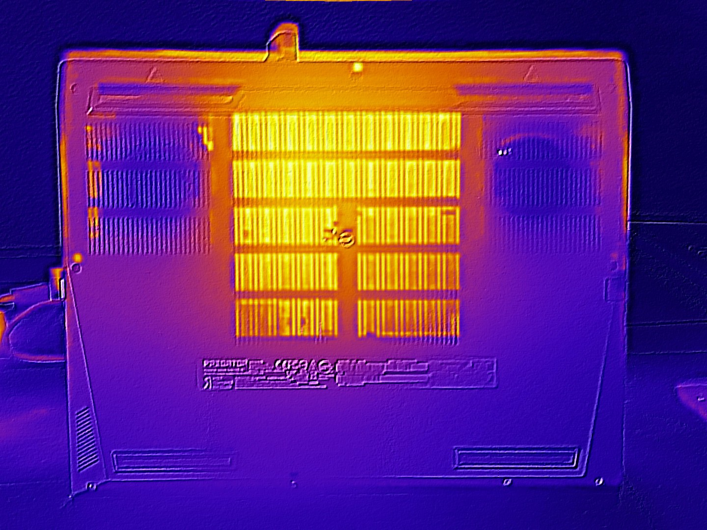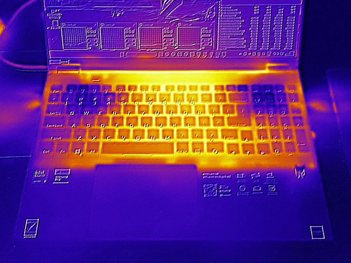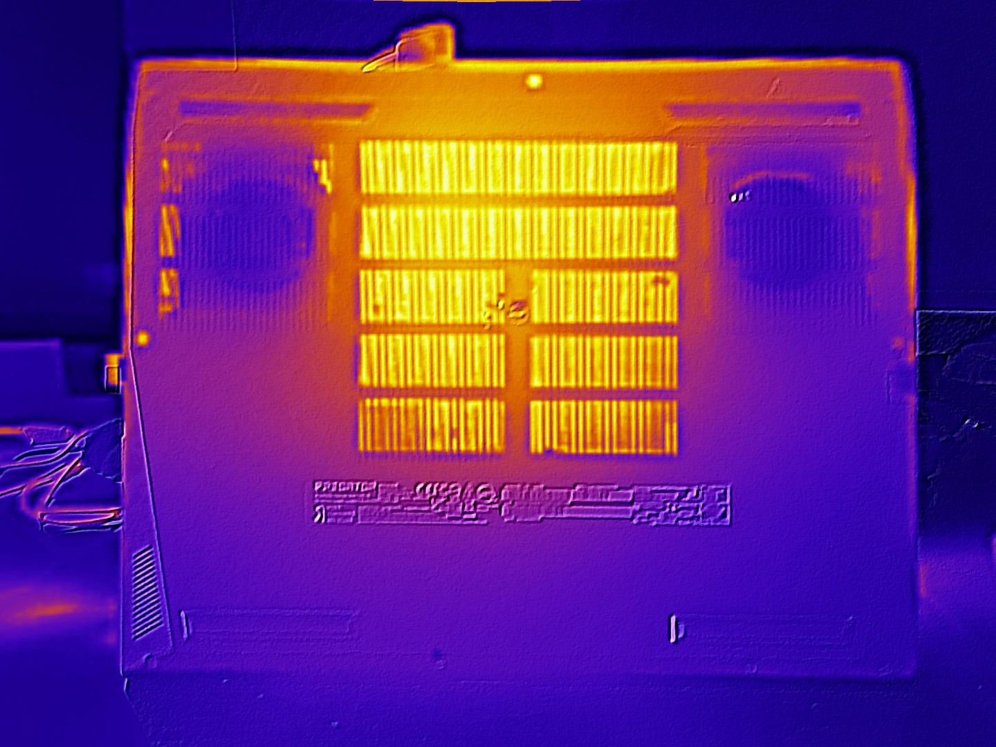 De conclusie met betrekking tot de temperatuurontwikkeling is vergelijkbaar. Zolang de notebook stationair draait, blijven de oppervlakken aangenaam koel en onder de 30 °C. In 3D-modus bereikt vooral de onderkant van de behuizing veel hogere temperaturen: een maximum van 55 °C pleit tegen gamesessies op schoot. De temperatuur aan de bovenkant is gematigder, met een maximum van 47 °C.