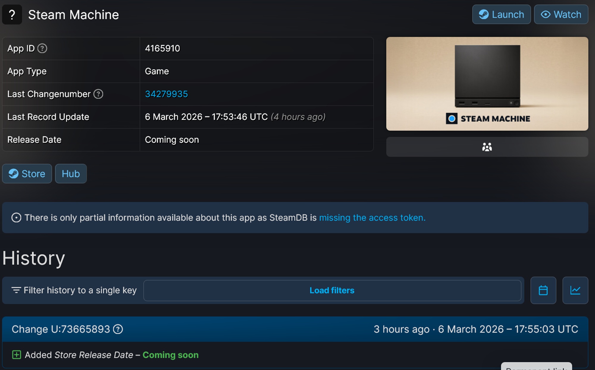 SteamDB controleert app- en pakket-ID's, evenals andere gegevens met betrekking tot Valve's marktplaats. Op 5 maart werden gewijzigde assets gedetecteerd, voordat de volgende dag meer significante wijzigingen werden doorgevoerd. De Store Release Date voor alle nieuwe hardware staat nu vermeld als "coming soon". Eerder hadden de pagina's geen herzieningen meer gezien sinds 18 november 2025.