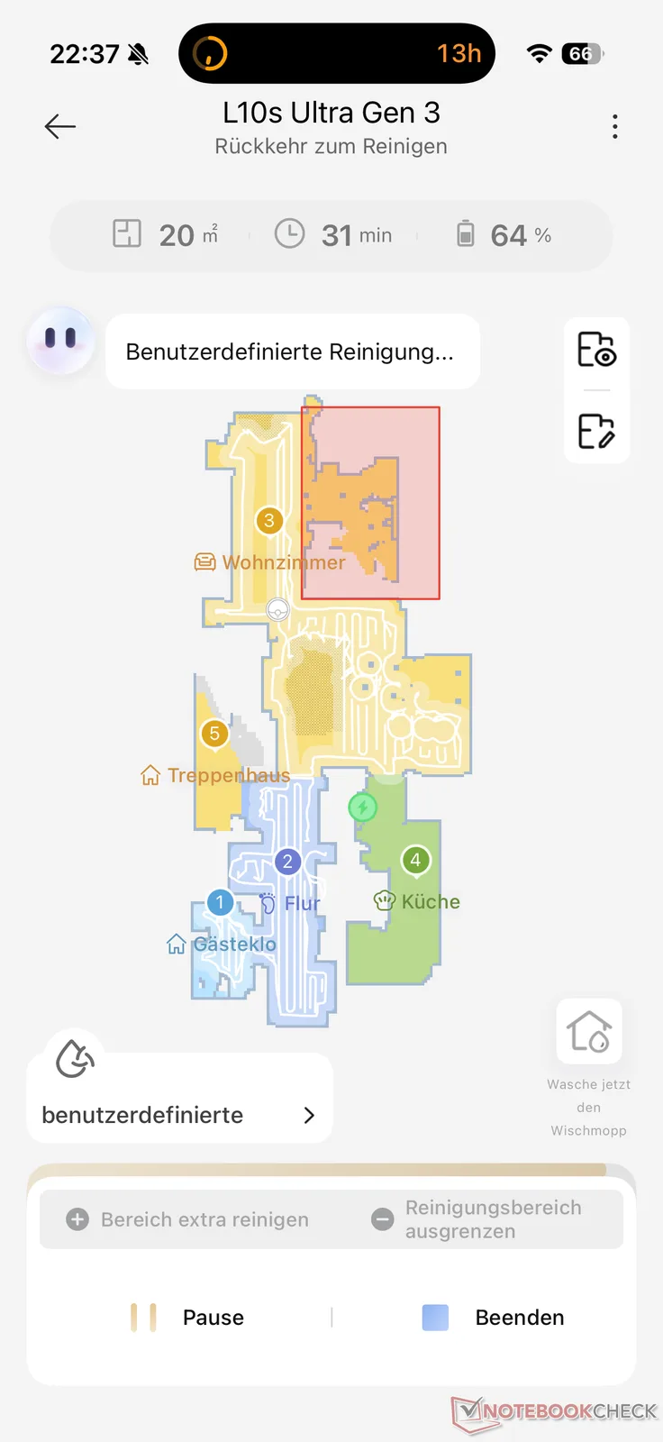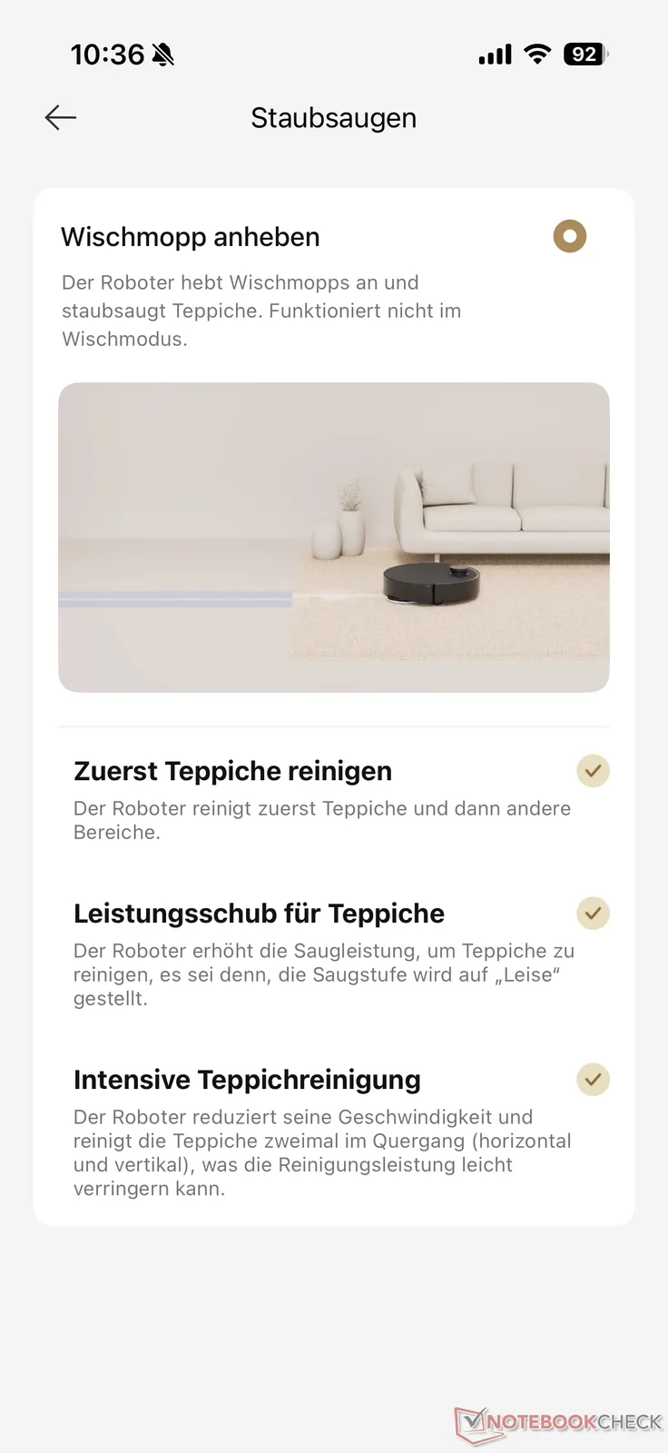 Bij langere pool bereikt het model (net als vele anderen) echter soms zijn grenzen. In de test bleven een paar zandkorrels achter op een testtapijt ondanks de maximale zuigkracht, ook al was het tapijt aan de oppervlakte vrij schoon. Een ander probleem is dat de mops maar 10 mm opgetild kunnen worden en niet neergezet kunnen worden. Het is zinvol om eerst de tapijtreiniging in de app te activeren voordat u de overige oppervlakken dweilt.