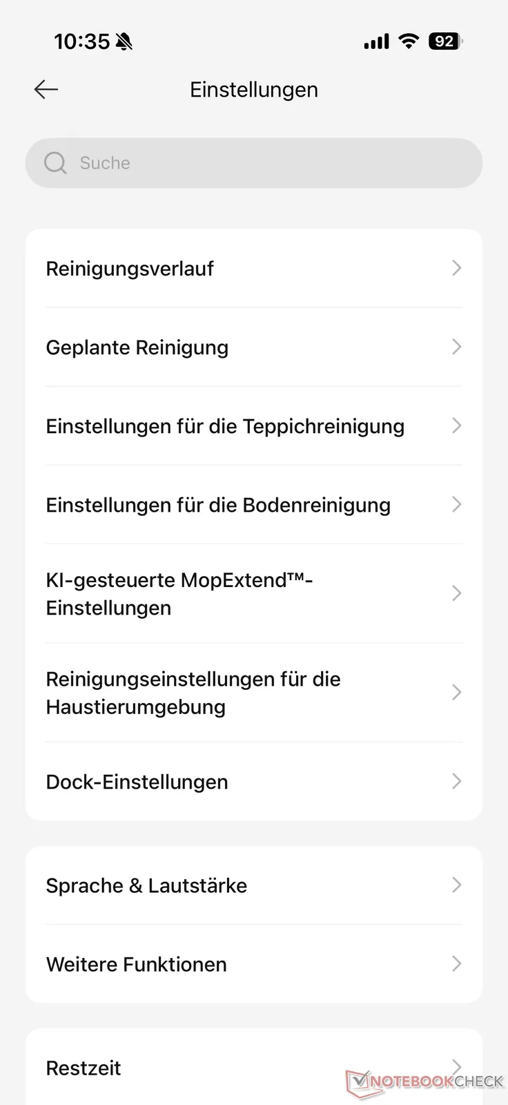 Naast reinigingsgeschiedenis, firmware-updates en dergelijke biedt het menu diverse andere instelmogelijkheden met betrekking tot tapijtreiniging, MopExtend en het dock. De selectie is niet zo groot als bij sommige topmodellen, maar is absoluut voldoende voor normale behoeften. Een praktische functie is de optie om tijdens minder drukke nachtelijke uren op te laden, bijvoorbeeld om te profiteren van dynamische elektriciteitstarieven.
