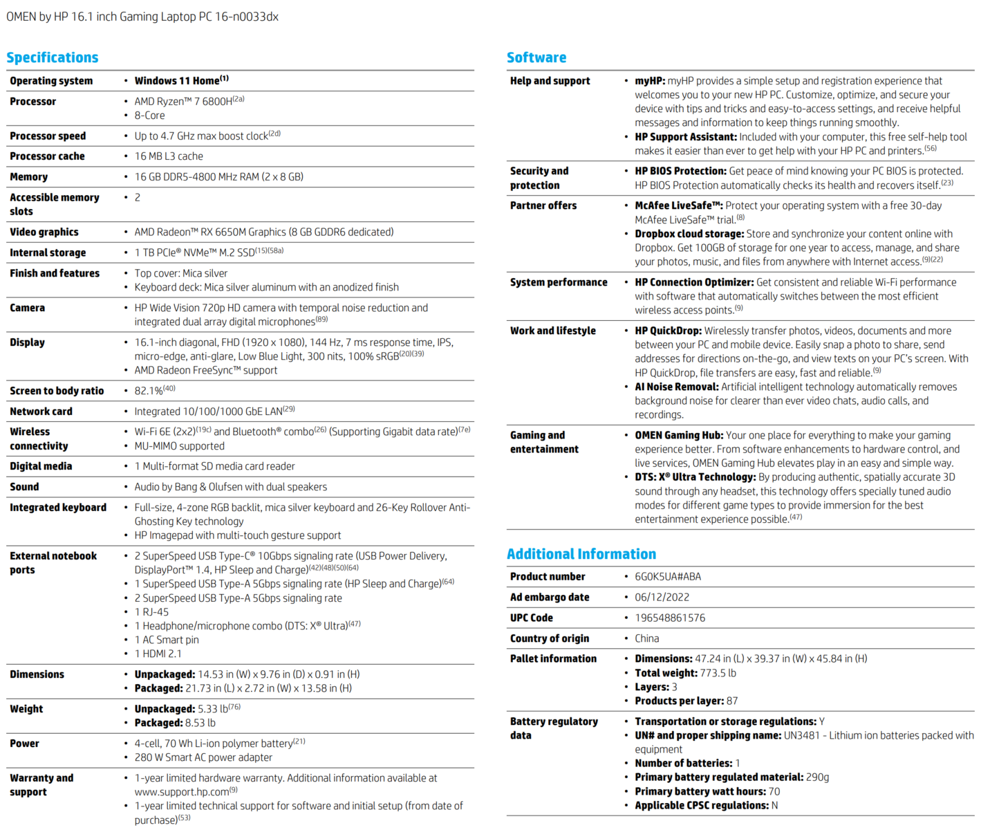 HP zei dat de Omen 16 kan worden geconfigureerd met maximaal een Intel Core i9-12900H of een AMD Ryzen 9 6900HX processor, tot 32 GB DDR5-4800 geheugen, en tot een 2 TB Gen 4 NVMe SSD. De Intel-variant wordt geleverd met GPU-keuzes tot een 140 W RTX 3060 of een 150 W RTX 3070 Ti