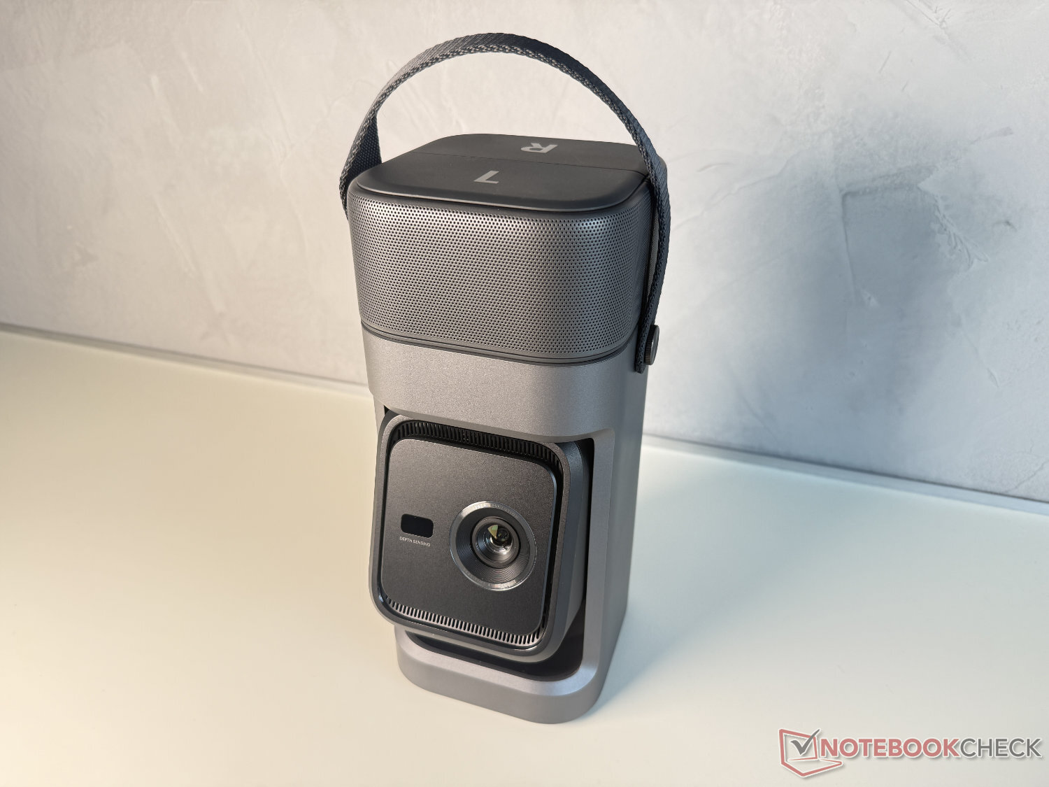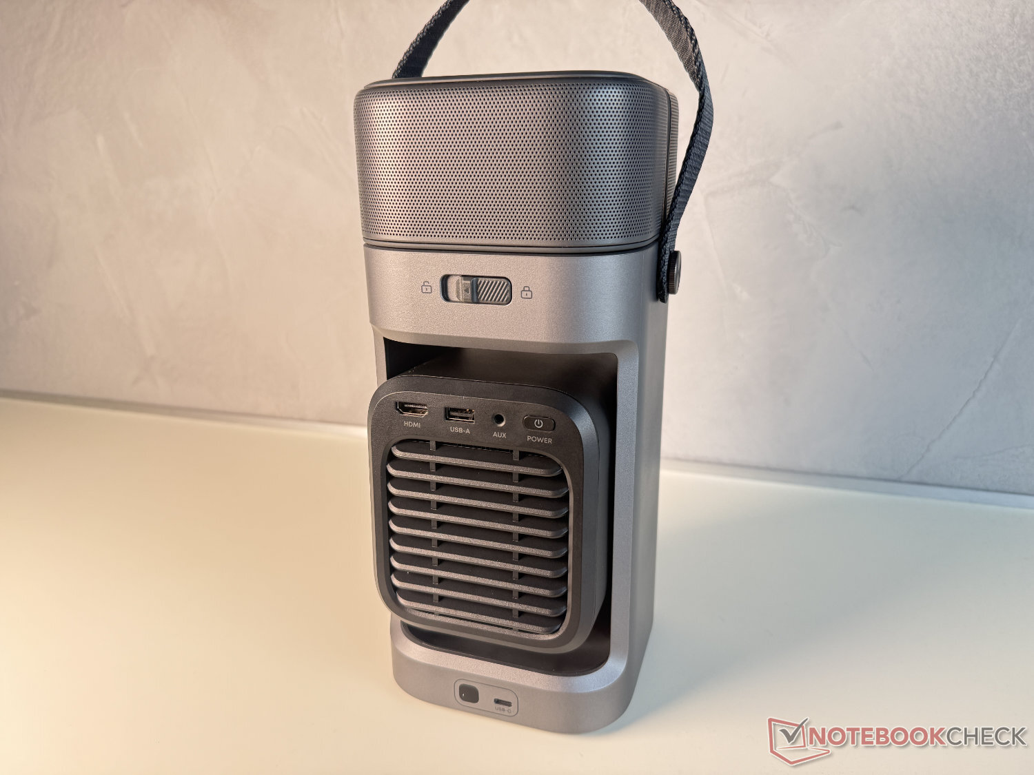 Net als bij de duurdere modellen X1 en X1 Pro heeft anker Soundcore ook bij de P1 afgezien van de integratie van een batterij. Dit is jammer voor zo'n mobiel concept, maar zou uiteindelijk tot grotere afmetingen, een hoger gewicht en een duurdere prijs hebben geleid. De Nebula P1 weegt inclusief de luidsprekers minder dan 2,4 kg en meet ongeveer 28 x 13 x 13 cm (inclusief luidsprekers), waardoor hij gemakkelijker te vervoeren is, wat ook wordt bevorderd door de flexibele draaggreep.