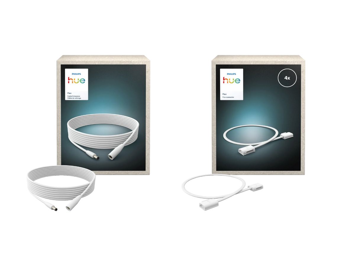 De Hue Flux Connector is I-vormig, terwijl de Flux Corner Connector L-vormig is. Beide kunnen worden gebruikt om stukken van de Flux lichtstrip met elkaar te verbinden om een langere lengte te creëren. De Flux Flex Connector is een alternatieve manier om twee lichtstripsecties op grote afstand met elkaar te verbinden, maar dit veroorzaakt een onderbreking in de verlichting. Met de Flux kabelverlenging kunnen de lampen op grotere afstand van de stroombron worden geplaatst. Bovendien kan de Flux-beugel voor bevestiging worden gebruikt om de lichtstrip aan een muur of plafond te bevestigen, met een transparant clipontwerp.