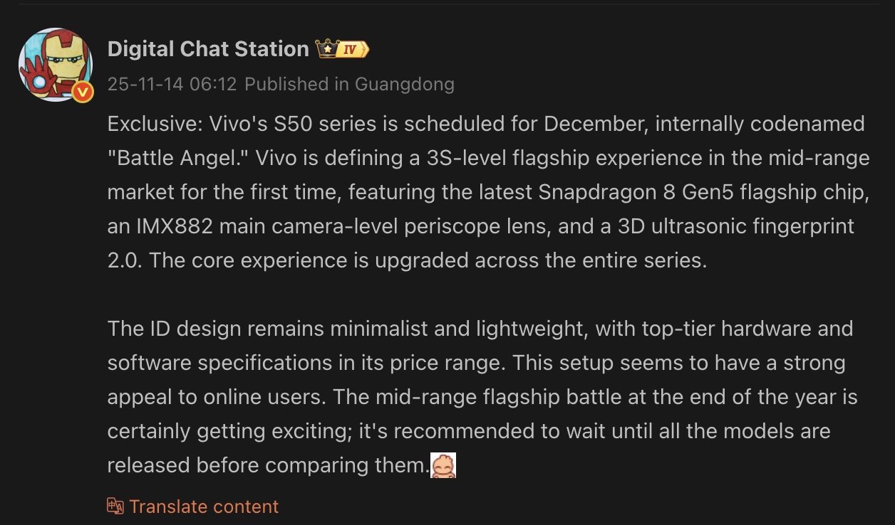Het is onduidelijk of de S50-serie ook twee modellen zal hebben zoals zijn voorganger. Tipster Digital Chat Station suggereerde eerder dat de serie een compact model zal hebben, waarschijnlijk gemerkt als de S50 Pro Mini. In een nieuw lek op https://weibo.com/6048569942/QdLymnukp?pagetype=profilefeedbeweert de tipgever dat de Vivo S50-serie gebruik zal maken van de nieuwe Qualcomm Snapdragon 8 Gen 5 processor zal gebruiken. Dit is een sub-vlaggenschip chipset van Qualcomm, die onder de Snapdragon 8 Elite Gen 5 gepositioneerd is. Ter referentie, de standaard S30 gebruikte de Snapdragon 7 Gen 4 en de S30 Pro Mini gebruikte de Dimensity 9300 Plus.