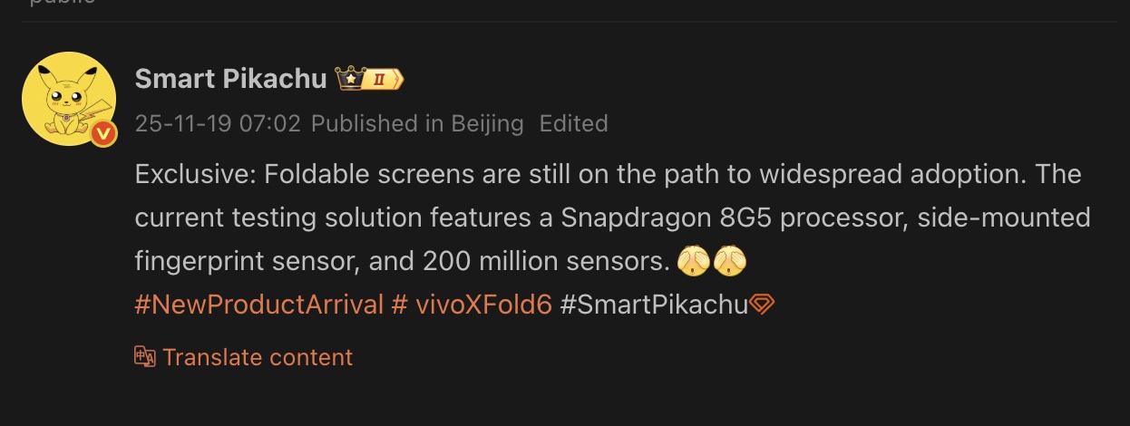 De tipgever suggereert ook dat het toestel een vingerafdrukscanner aan de zijkant zal hebben. Andere specificaties blijven voorlopig nog een mysterie. Vivo's vlaggenschip opvouwbare smartphone zou in het tweede kwartaal van 2026 op de markt moeten komen.