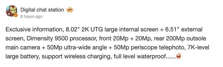 Bovendien behoudt de X Fold6 ondersteuning voor draadloos opladen en wat volgens Digital Chat Station 'top-tier' waterbestendigheid is. Blijkbaar zal Vivo ook overstappen op MediaTek en zijn Dimensity 9500 chipset voor de X Fold6. De Dimensity 9500 is een 3 nm-chipset die al te vinden is in de Zoek X9de X300 en hun Pro tegenhangers.