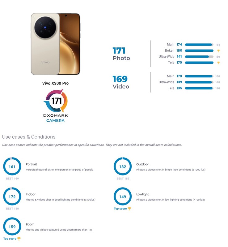 De fotoscore van 171 punten in vergelijking met 173 voor de Vivo X200 Ultra laat bijvoorbeeld zien dat Vivo's huidige Ultra vlaggenschip nog steeds de overhand heeft in die categorie. De videoscore op is echter is echter drastisch verbeterd, aangezien de Vivo X300 Pro 169 punten krijgt in vergelijking met 156 voor de Vivo X200 Ultra. In de videodiscipline neemt de Vivo X300 Pro zelfs de tweede plaats in direct achter de iPhone 17 Pro, dus het is momenteel de beste Android telefoon voor het opnemen van video's volgens DxOMark.