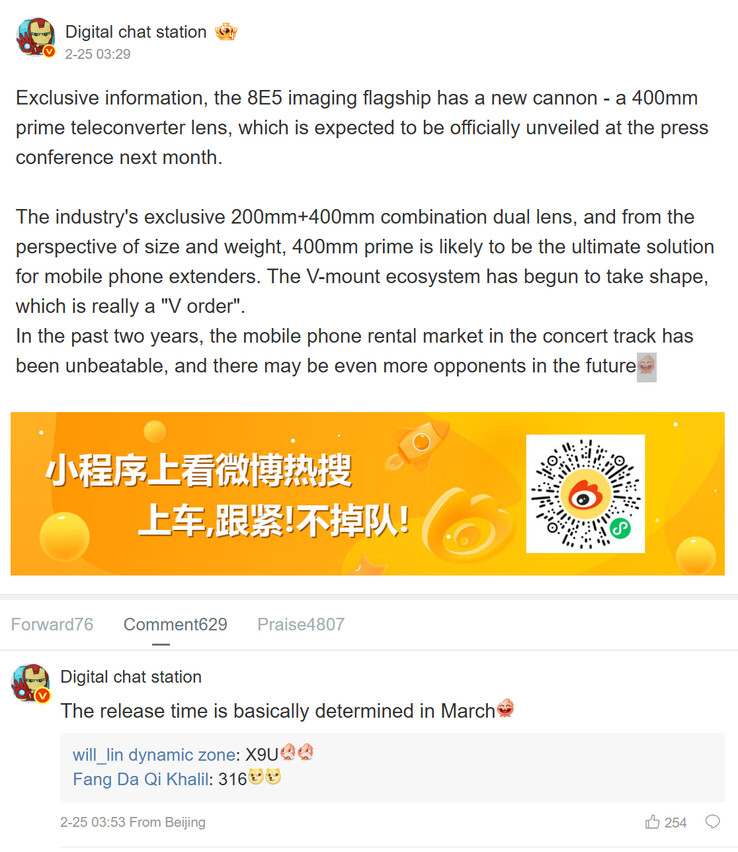 Bovendien heeft Digital Chat Station gesuggereerd dat de Vivo X300 Ultra ook vergezeld zal worden door een nieuw teleconverter-accessoire dat twee equivalente brandpuntsafstanden mogelijk maakt. Schrijvend op Weibo beweert het lek dat het accessoire 200 mm en 400 mm modi zal ondersteunen als aanvulling op de verwachte 85 mm telefoto die in de X300 Ultra zit.