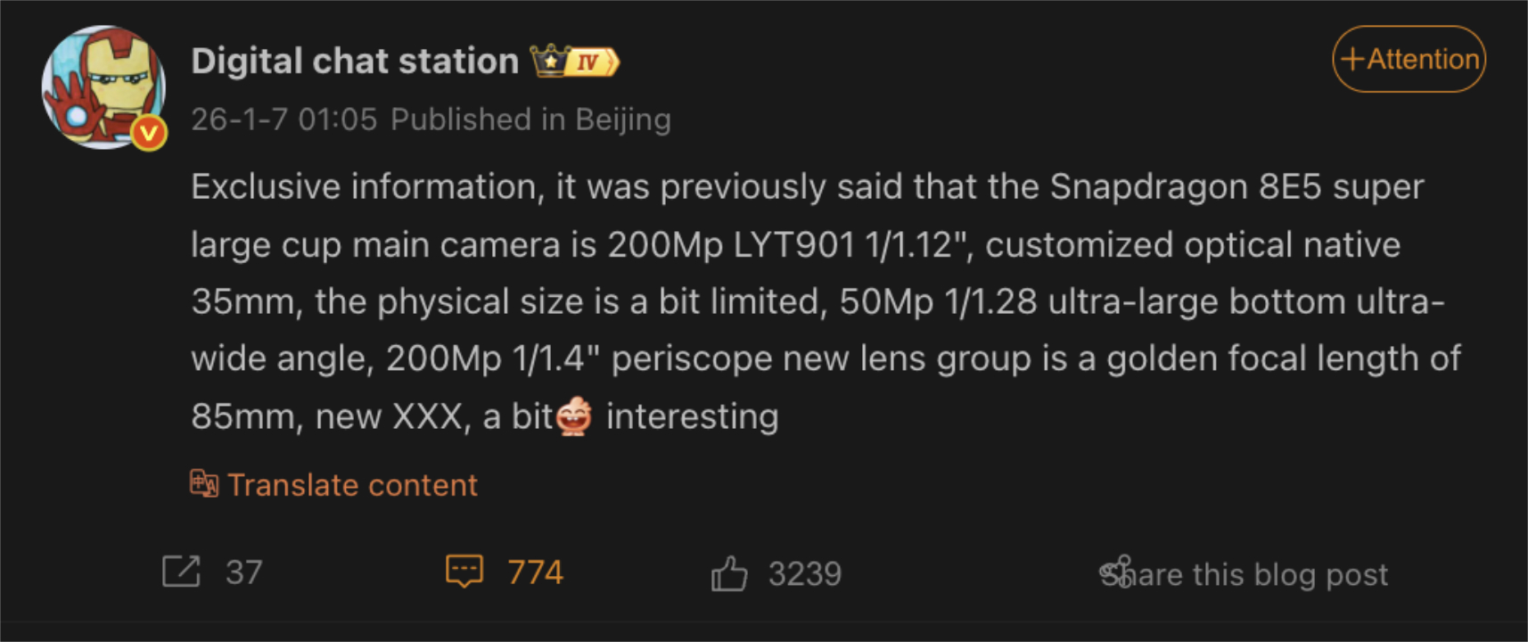 Schrijvend op Weibo herhaalt dezelfde leaker dat de X300 Ultra net als de Galaxy S26 Ultra en de OnePlus 15 Qualcomm's Snapdragon 8 Elite Gen 5 platform. Daarnaast schrijven ze dat de volgende camera hardware gepland blijft: