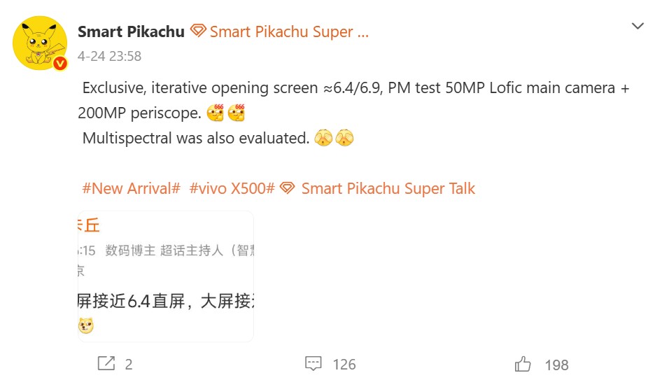Er werd bijvoorbeeld onlangs het gerucht dat de Vivo X500 en X500 Pro mogelijk niet langer dezelfde chipset zullen delen en een nieuwe camerasensor. Interessant genoeg is deze sensor naar verluidt een opvolger van de 1/1,28-inch 50 MP Sony LTY-928 die in de X300 Pro zit, in plaats van de 1/1,12-inch 200 MP Sony LYT-901 die in de X300 Ultra wordt gebruikt. Hoewel dat een beetje een tegenvaller is, is het wel logisch voor de onlangs gelanceerde Vivo X300 Ultra enkele voordelen ten opzichte van de X300 Prodie naar verwachting in de tweede helft van 2026 zal debuteren.
