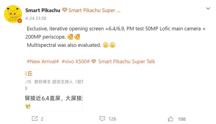 Een ander interessant detail van de leaker is dat Vivo mogelijk in navolging van Apple en Xiaomi de X500 Pro in twee schermformaten uitbrengt, in ieder geval in China: een compactere 6,4-inch standaardversie en een grotere 6,9-inch Pro Max-variant