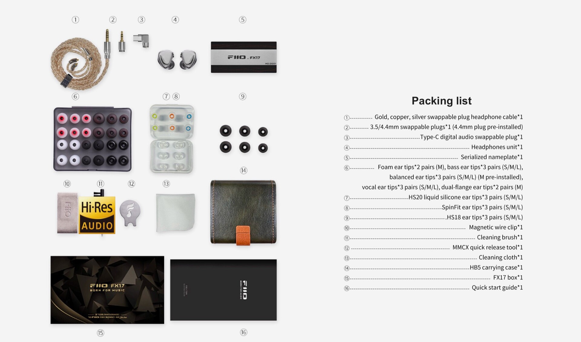 De FiiO FX17 hebben een gevoeligheid van 104 dB/mW bij een impedantie van 16 ohm. Deze nieuwe oordopjes maken gebruik van een MMCX-kabel die eenvoudig vervangen kan worden in geval van een defect. De meegeleverde 4ft kabel combineert goud, zilver en koper, en kan optioneel worden uitgerust met een 3,5mm, 4,4mm of USB-C plug. De USB-C adapter heeft een geïntegreerde DAC die geluid tot 32 bit bij 384kHz ondersteunt.