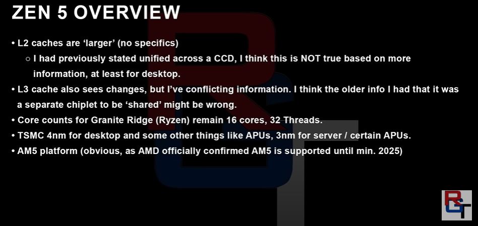 Wat het aantal kernen betreft, melden zowel MLID als RedGamingTech dat de desktop Granite Ridge Zen 5-chips beperkt zullen zijn tot 16 kernen en 32 threads. MLID voegt hieraan toe door te stellen dat AMD "een 32-core Zen 5c model zou kunnen lanceren als ze dat willen". Over de lancering gesproken, Tom suggereert dat Zen 5 zou kunnen uitkomen in H1 2024, mogelijk Q1.