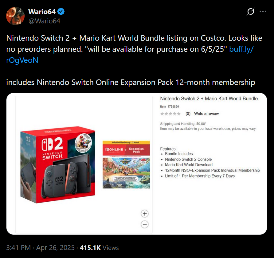 Wario64 op sociale media merkte als eerste de nieuwe Costco-vermelding op. Kopers kunnen een jaar Nintendo Switch Online + Expansion Pack kopen voor $49,99. De standaard Mario Kart World bundel, die een populaire Switch 2 pre-order optie is, kost $499,99. Wario64 speculeerde dat een korting voor Costco-leden de prijs zou kunnen verlagen van $549,99 naar $539,99. Na navraag melden sommige klanten een mogelijk lagere Switch 2 prijs.