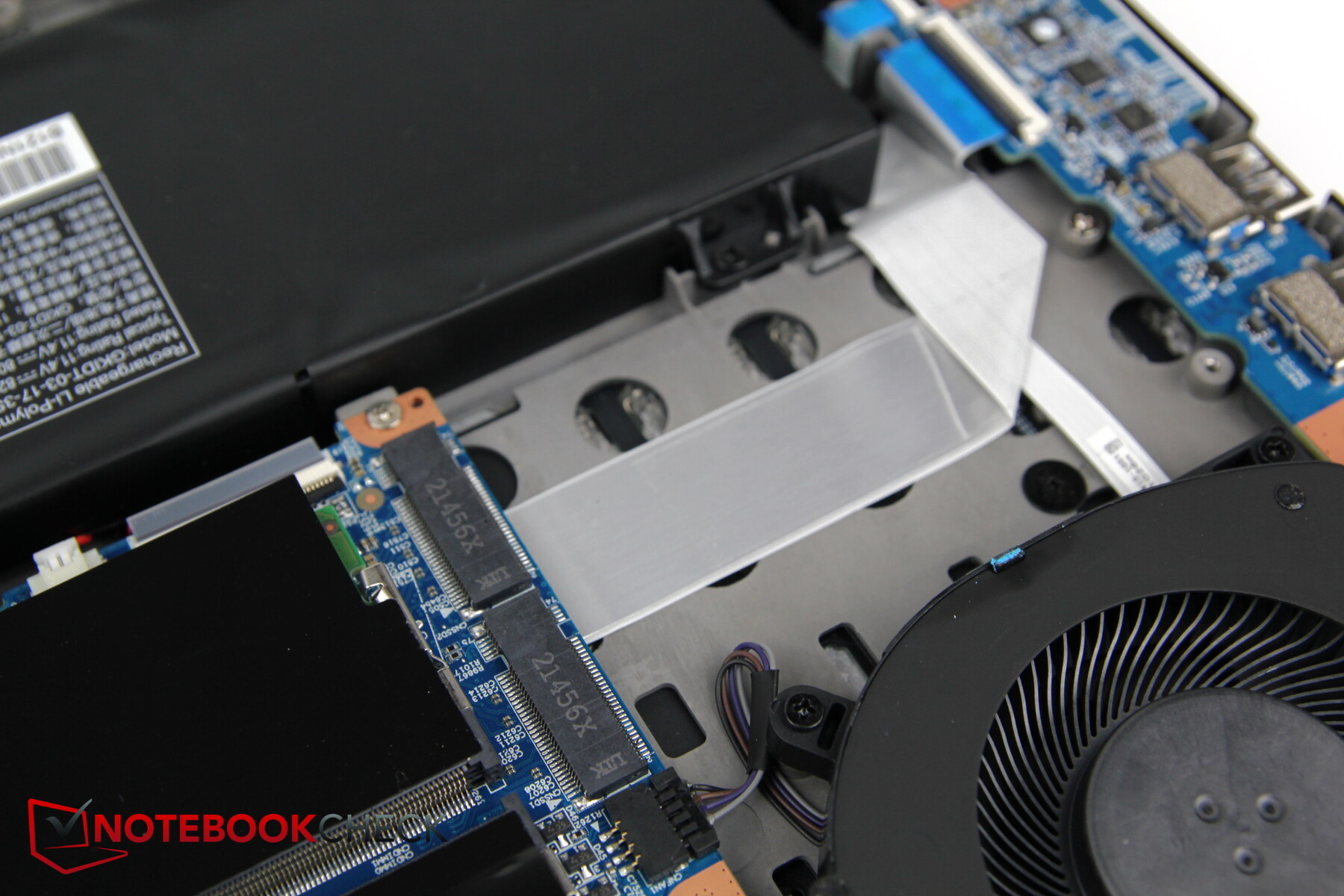 De ventilatoren, de heat pipes inclusief het watercircuit, twee RAM, en M.2 SSD slots, evenals de Wi-Fi module zijn dan toegankelijk. Dit laat ook zien hoe gemakkelijk het zou zijn om een effectief, extra watercircuit te implementeren voor de fabrikant, mocht het model populair worden.