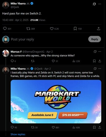 Sommige lezers waren verrast toen Ybarra's eerste reactie op X was: "Ik sla de Switch 2 over." Ybarra legde uit dat hij niet enthousiast was over de Switch 2 spellen die tijdens de Direct werden getoond. Hij had ook bezwaar tegen de beloofde verbeterde prestaties op Nintendo's nieuwe console. In een reactie op het nieuws dat The Legend of Zelda: Tears of the Kingdom met 4K 60fps op het systeem draait, zei Ybarra: "Het ziet eruit als een spel uit 2000."