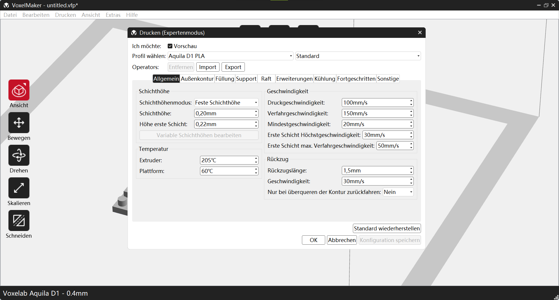 Afgezien van de fouten in de Duitse vertaling is de interface echter vrij comfortabel. Numerieke waarden kunnen worden ingevoerd via een nummerveld en de gebruikelijke besturingsopties zijn beschikbaar. Alleen een wizard voor handmatige aanpassing van het printbed en een instelmogelijkheid voor de extrusiefactor zijn niet beschikbaar.