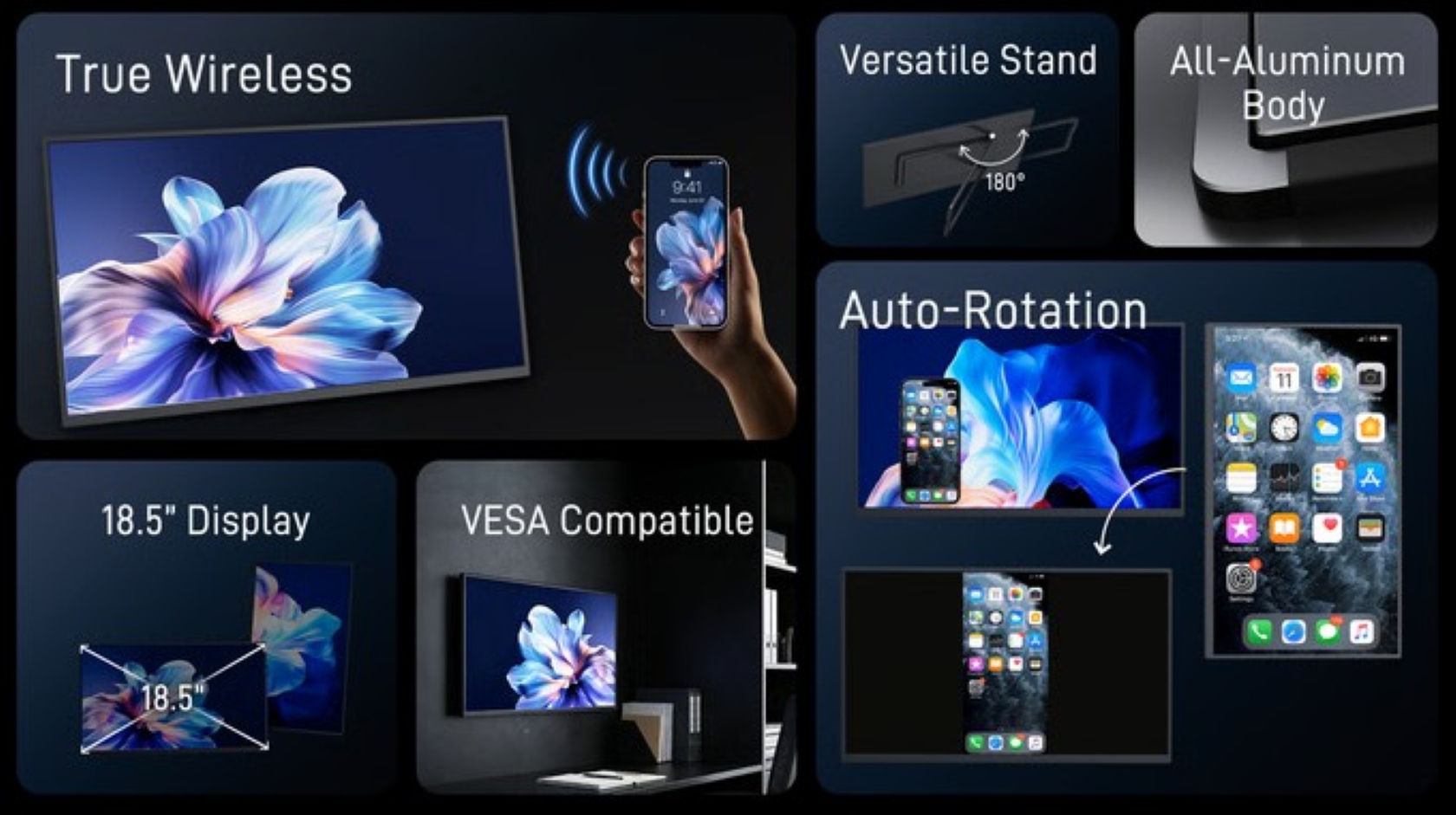 Het bedrijf benadrukt de vele manieren om de monitor op te stellen, waaronder via een 75x75mm VESA-bevestiging of de ingebouwde kickstand. Het ondersteunt ook zowel portret- als landschapsoriëntatie. Hoewel de Vuelim kan werken als een conventionele bedrade monitor dankzij de USB-C DisplayPort en HDMI-interface, blijft de belangrijkste functie de draadloze mogelijkheid via een 5GHz Wi-Fi-module, waardoor het draadloos verbinding kan maken met Windows-, macOS-, Android - en iOS-apparaten.