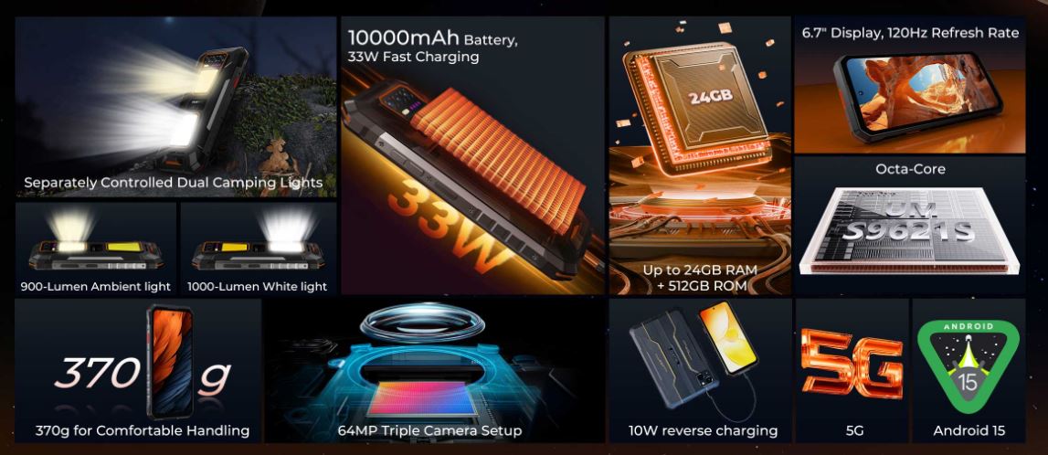 Hoe dan ook, de Oukitel smartphone is uitgerust met een 10.000mAh batterij die kan worden opgeladen met maximaal 33 watt. Het ondersteunt ook 10W omgekeerd opladen, dus het kan gebruikt worden als een powerbank. Bovendien wordt de WP58 Pro aangedreven door een SoC met acht kernen en 5G-ondersteuning, dus hij is niet beperkt tot 4G LTE zoals sommige andere goedkope robuuste smartphones. De overige specificaties omvatten 8GB RAM, terwijl de 512GB opslagruimte ook redelijk groot is. De telefoon draait standaard op Android 15, en gebruikers kunnen de opslag uitbreiden via microSD door een van de dubbele simkaartsleuven op te offeren.