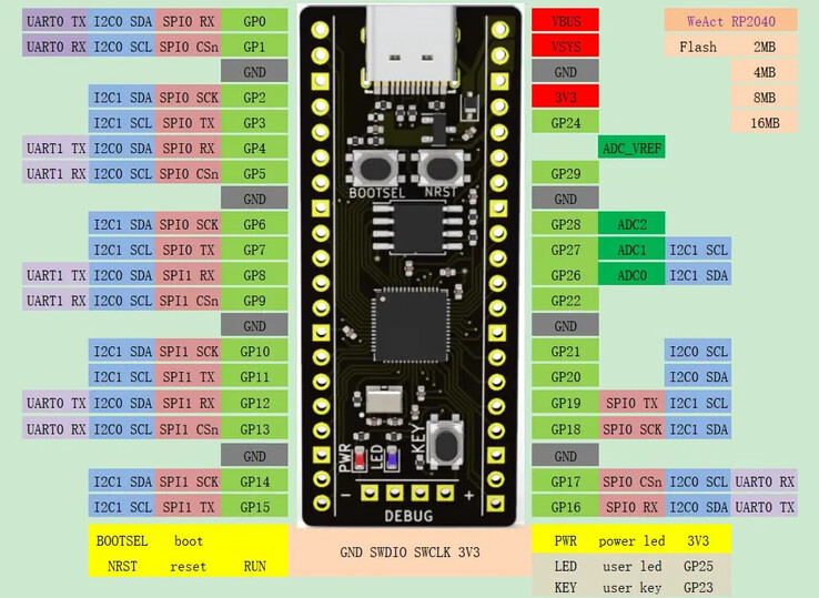 Daarvoor in de plaats komt een USB 1.1 Type-C poort die de WeAct RP2040 gebruikt voor programmering en voeding. Bovendien draaien de dubbele Cortex-M0+ kernen op 133 MHz, maar zijn ze overklokbaar tot 250 MHz of hoger. Bovendien bevat de WeAct 2 MB tot 16 MB QSPI flash, nog een voordeel ten opzichte van de Raspberry Pi Pico. WeAct heeft zelfs een NRST-resetknop ingebouwd, plus dubbele 20-pins headers met 2,54 mm pitch.