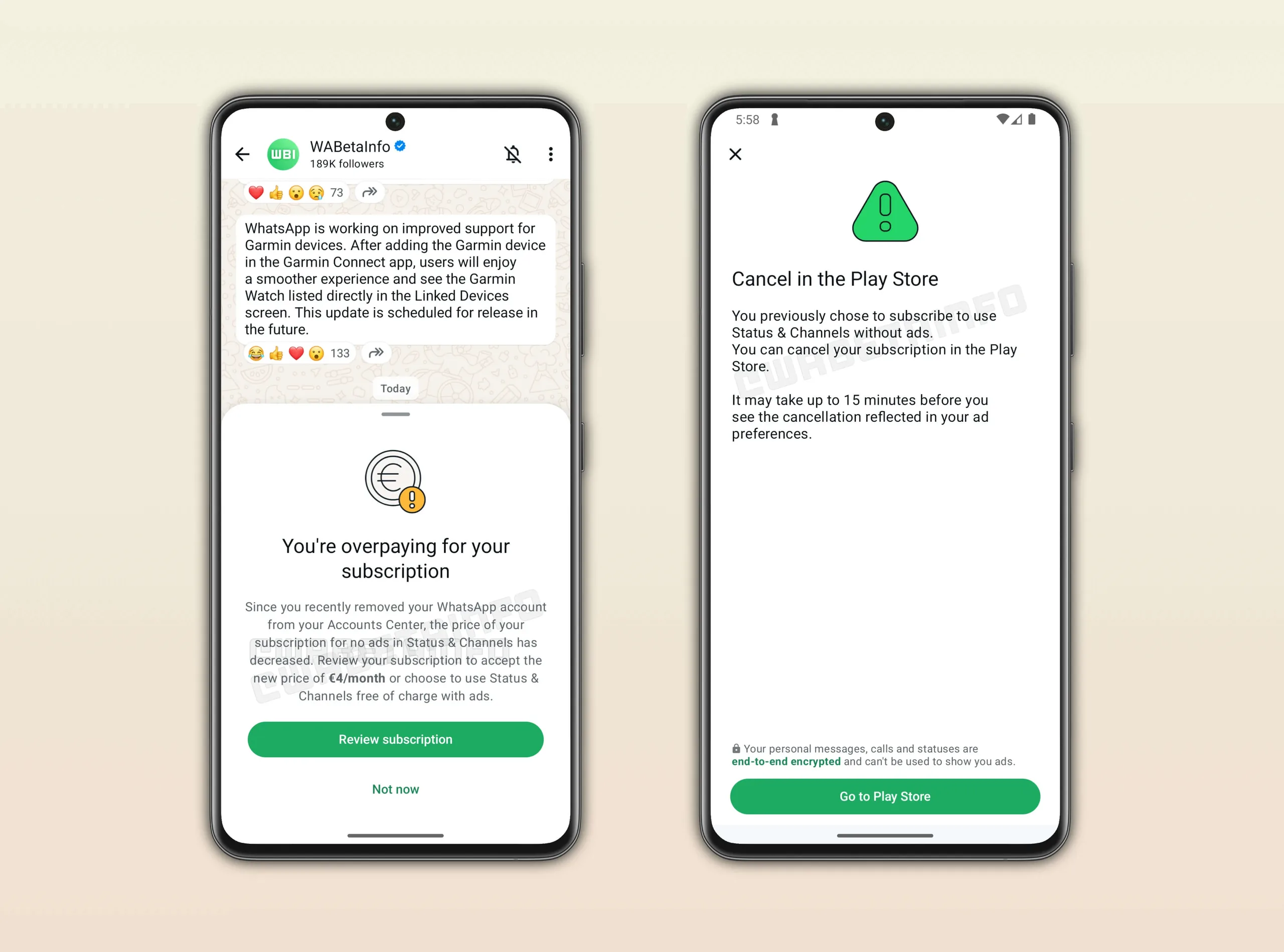 Het abonnement is waarschijnlijk gericht op gebruikers die waarde hechten aan ononderbroken gebruik bij het bekijken van statusupdates of het browsen door hun kanalen. Het WhatsApp-abonnement zal naar verwachting ook de eerder genoemde kanaalsuggesties verbergen. Een screenshot toont een maandelijks abonnement van €4, hoewel dit misschien slechts een placeholder is. Het is onduidelijk of en wanneer deze nieuwe WhatsApp-update wordt uitgerold.