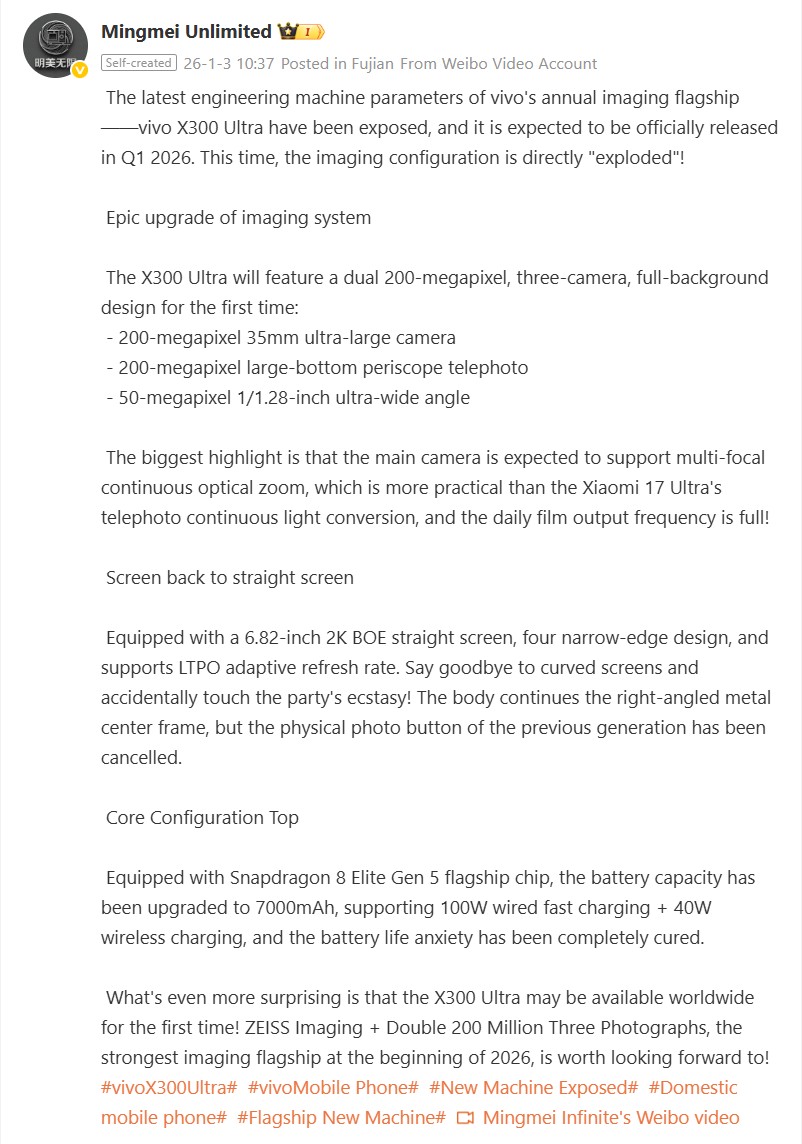 Het eerste weekend van het jaar brengt ons een vrij spectaculair gerucht over de Vivo X300 Ultra, die naar verwachting het eerste Vivo Ultra vlaggenschip zal zijn dat wereldwijd wordt gelanceerd en naar verwachting in het eerste kwartaal zal debuteren, waarschijnlijk in maart. Volgens een Weibo-gebruiker (zie screenshot hieronder) zal de Vivo X300 Ultra beschikken over een 200MP 35mm hoofdcamera, een 200MP periscoop telefotocamera en een grote 1/1.28-inch 50MP ultra-groothoekcamera, wat niet bepaald nieuwe informatie is.