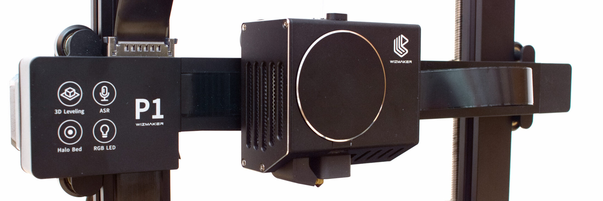 De printkop van de Wizmaker P1 bevat de hotend en de extruder. Een filament sensor is ook direct boven de extruder geïnstalleerd. Zodoende legt het filament een zeer korte afstand af van de sensor naar de nozzle. Het aandrijfwiel van het filament heeft een vrij kleine diameter, zodat de aandrijving krachtig is, hoewel er hier geen versnellingsbak is om het koppel van de stappenmotor te versterken. De printkop van de Wizmaker P1 heeft een opvallend geïntegreerd ontwerp. Alle onderdelen hier zijn verborgen achter het ronde deksel, dat gemakkelijk kan worden geopend via de kleine knop aan de bovenkant. Het veerbelaste drukwiel van de extruder is ook in dat deurtje geïntegreerd. Wanneer het deksel open is, kan men dus het filamentpad zien en mogelijke problemen identificeren.