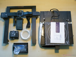 Het pakket bevat al het gereedschap dat nodig is voor de assemblage, een flush cutter en wat filament. Bij het uitpakken van de 3D printer rees heel even het vermoeden dat de kleine onderdelen zouden ontbreken. Ze zaten echter goed verpakt in het bakje rechtsonder op de basiseenheid.
