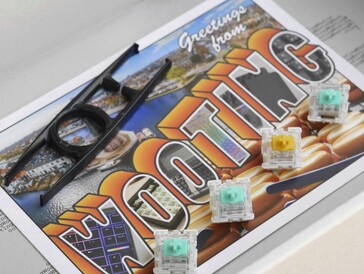 Het is duidelijk te zien dat Wooting veel aandacht heeft besteed aan de verpakking. Alles is milieuvriendelijk en recyclebaar of composteerbaar, of op zijn minst gedeeltelijk gerecycled, van de vrij eenvoudige golfkartonnen doos met de slimme monochrome printtextuur tot de kleine zakjes met accessoires. Dit is een thema dat we terugzien in het hele ontwerp van de Wooting 80HE, en niet alleen in de verpakking. Afgezien van het Wooting 80HE toetsenbord, voorin en midden onder een wegwerpstofhoes, bevat Wooting een gecombineerde trekker voor toetsen en schakelaars, een dikke gevlochten USB Type-C naar Type-C kabel, een transparante USB Type-C naar Type-A adapter, een handvol extra navigatietoetskapjes en een extra Super toetskapje met een Wooting logo, drie sets vastklikbare rubberen voetjes om de hoogte aan te passen, en drie extra Wooting Lekker L60 V2 schakelaars, samen met een lichtere Lekker L45 V2 voor de extra zekerheid.