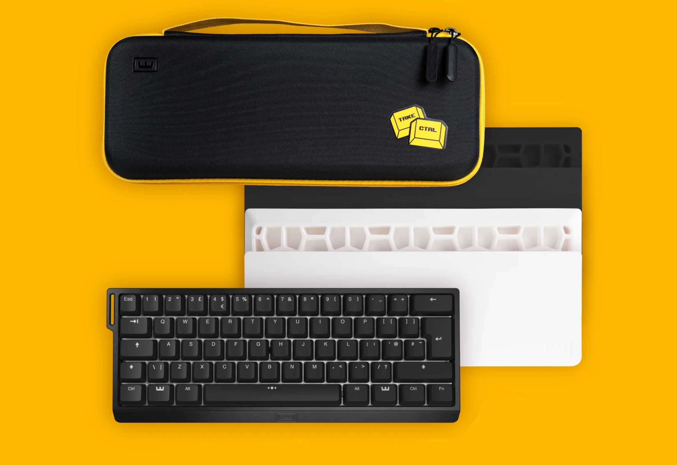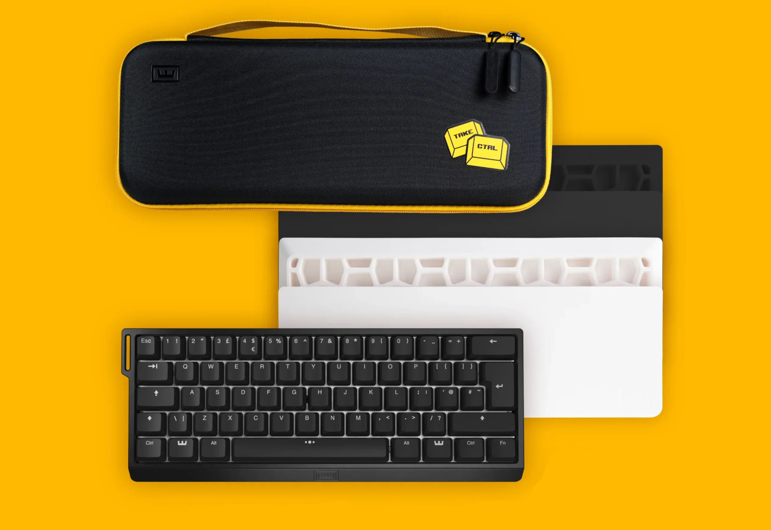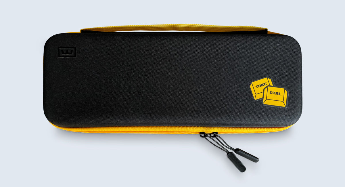 De gratis draagtas die u voor Black Friday bij de Wooting 60HE krijgt, lijkt veel op de draagtas die bij de Iqunix EZ63 die we eerder hebben beoordeeld. De Wooting draagtas is alleen verkrijgbaar in zwart met gele accenten, passend bij de standaardband van de 60HE, en is gemaakt van een harde EVA buitenkant met een zacht fluwelen binnenkant waarin het toetsenbord zich kan nestelen. Net als de 60HE zelf, is de hoes expliciet compatibel met andere 60% toetsenborden "met vergelijkbare afmetingen"