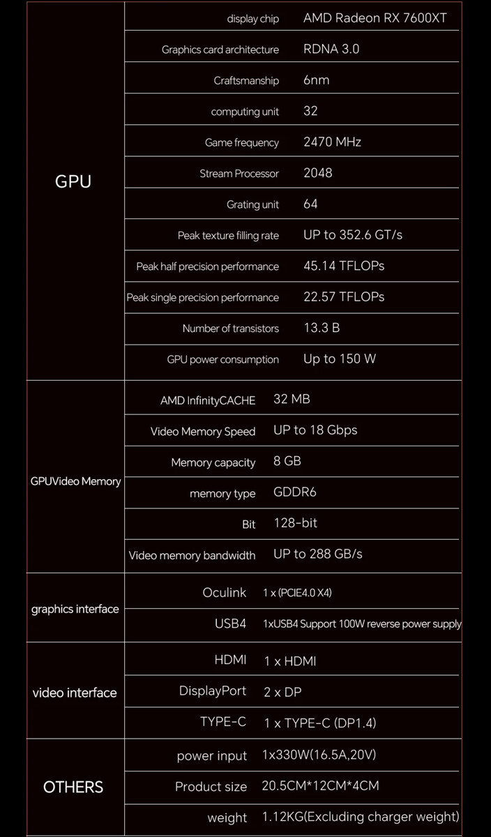 Aan de andere kant gebruikt de XG76XT een GPU die nog niet eerder op de eGPU-markt is verschenen. Aanvankelijk dachten we dat Aoostar de Radeon RX 7600M XT bedoelde toen het naar de Radeon RX 7600 XT verwees in zijn marketingmateriaal. De volledige specificaties van het bedrijf bevestigen echter de opname van een desktopvariant, wat wel eens een primeur voor de eGPU-markt zou kunnen zijn.
