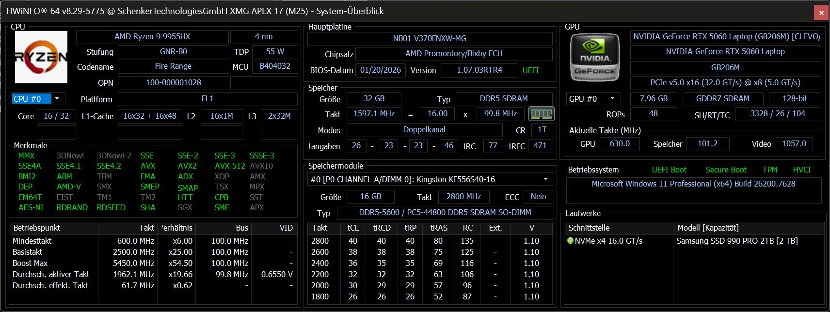 | Schenker XMG Apex 17 M25 AMD Ryzen 9 9955HX ⎘ NVIDIA GeForce RTX 5060 Laptop ⎘ 32 GB Geheugen, 2048 GB SSD | Catalogusprijs: 1899 Euro | 2.8 kg | 28.6 mm | 17.30" 2560x1440 170 PPI IPS | |