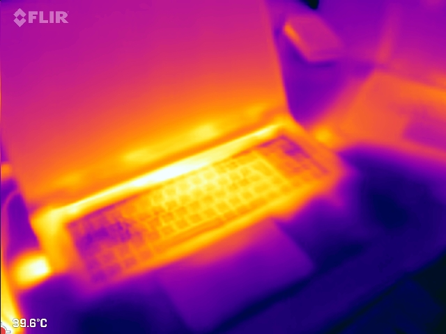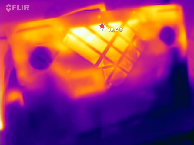 Het luide koelsysteem houdt de temperaturen over het algemeen laag. Onder belasting worden er in het midden van de onderkant hotspots van ongeveer 45°C gemeten, terwijl andere delen aanzienlijk koeler blijven.