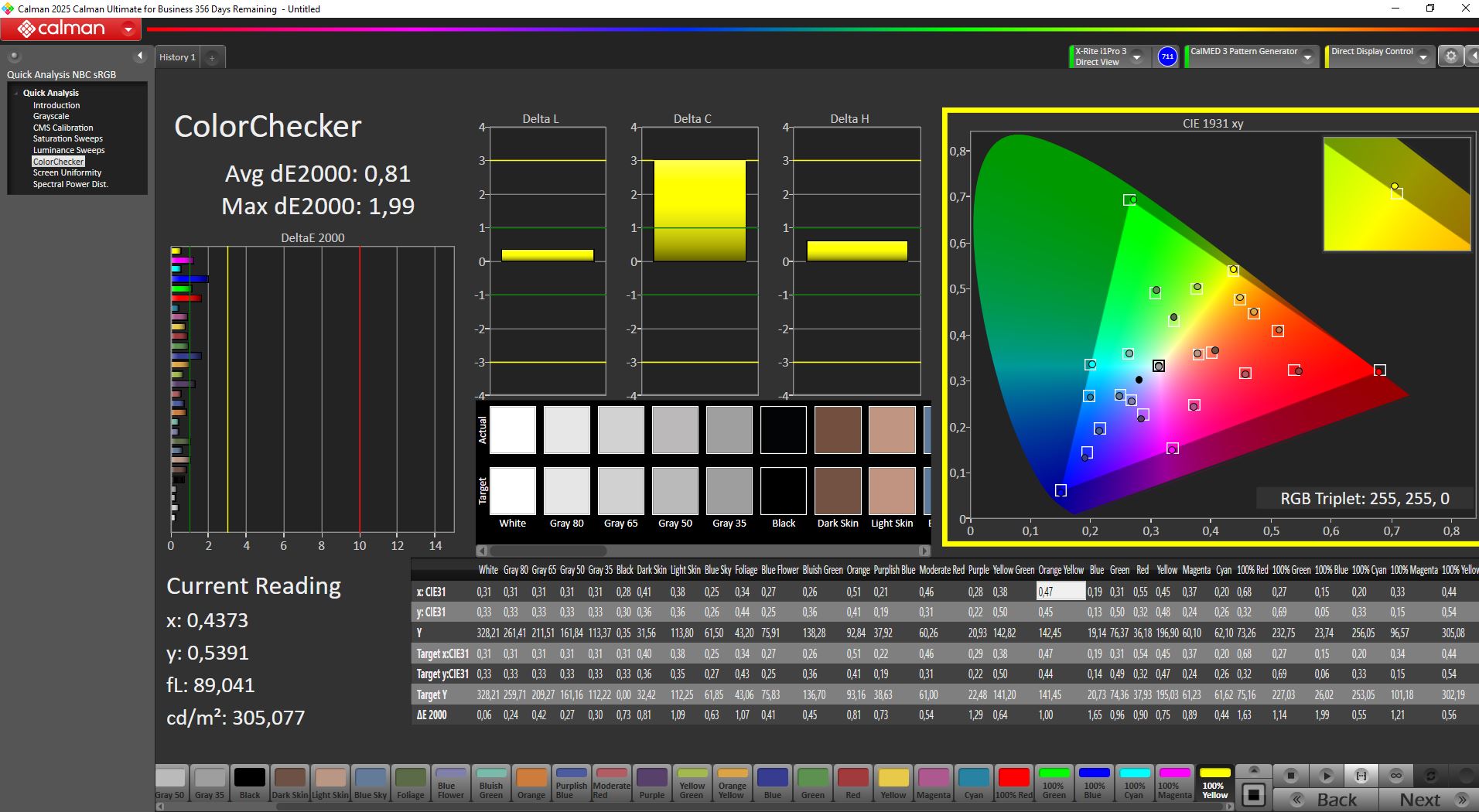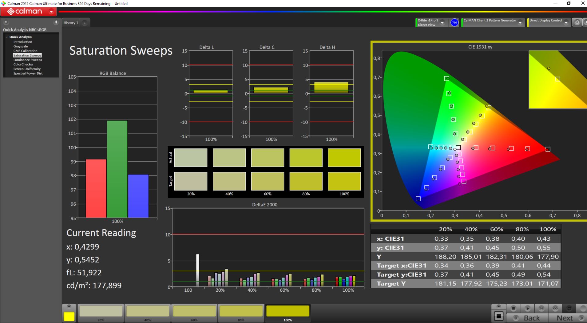 Uit de doos is de kalibratie slecht, met hoge DeltaE-afwijkingen. Na handmatige herkalibratie hebben we de afwijkingen in grijswaarden en kleuren teruggebracht tot minder dan 1 - uitstekende resultaten. Ons gekalibreerde ICC-profiel kunt u hierboven downloaden.