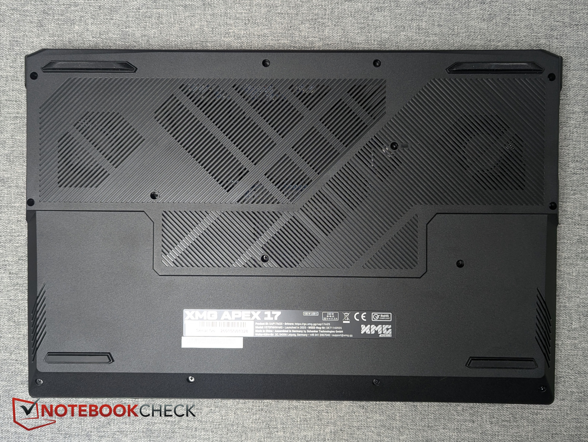 Visueel staat het stevige, ingetogen zwarte chassis dichter bij de Focus 17 M25 dan bij de Apex 16 Max. Het deksel is van metaal (en gevoelig voor vingerafdrukken), terwijl de rest van het chassis van hard plastic is gemaakt. Binnenin vindt u twee SO-DIMM slots en twee M.2 PCIe 4.0 slots.