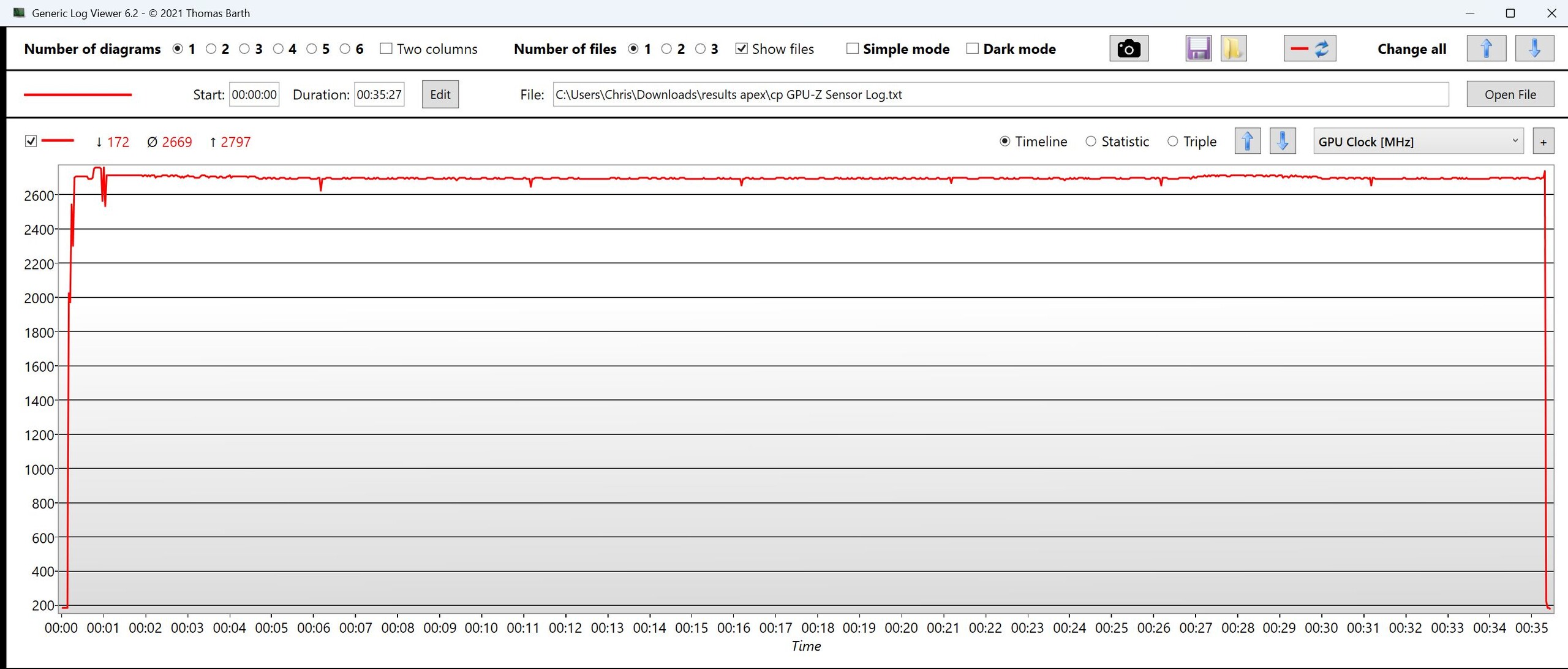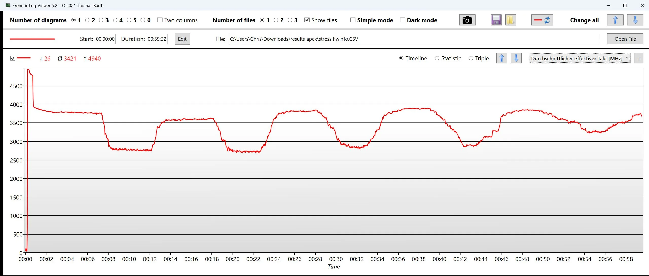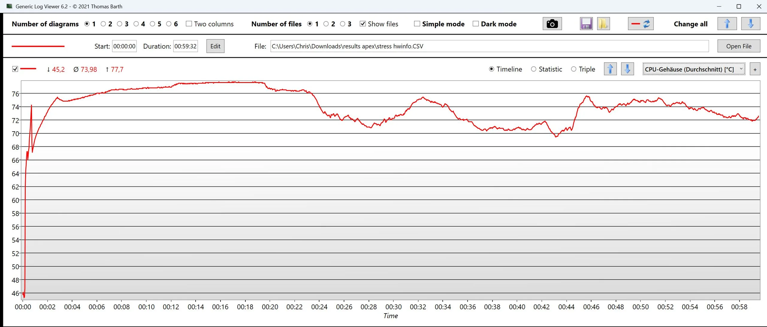 | CPU-klok (GHz) | GPU-klok (MHz) | Gemiddelde CPU-temperatuur (°C) | Gemiddelde GPU-temperatuur (°C) | |
