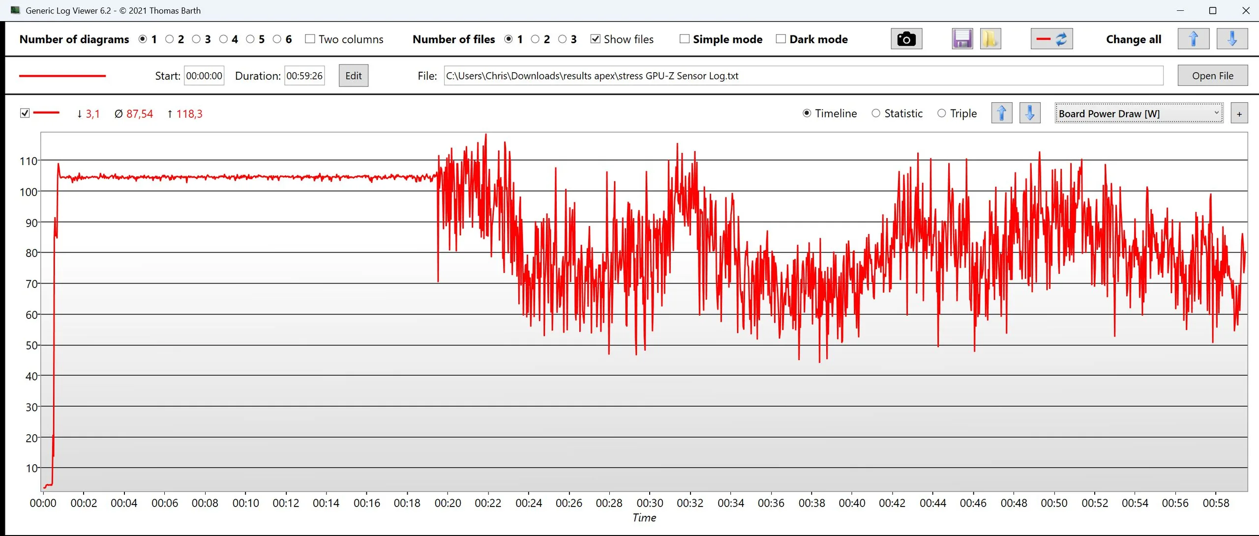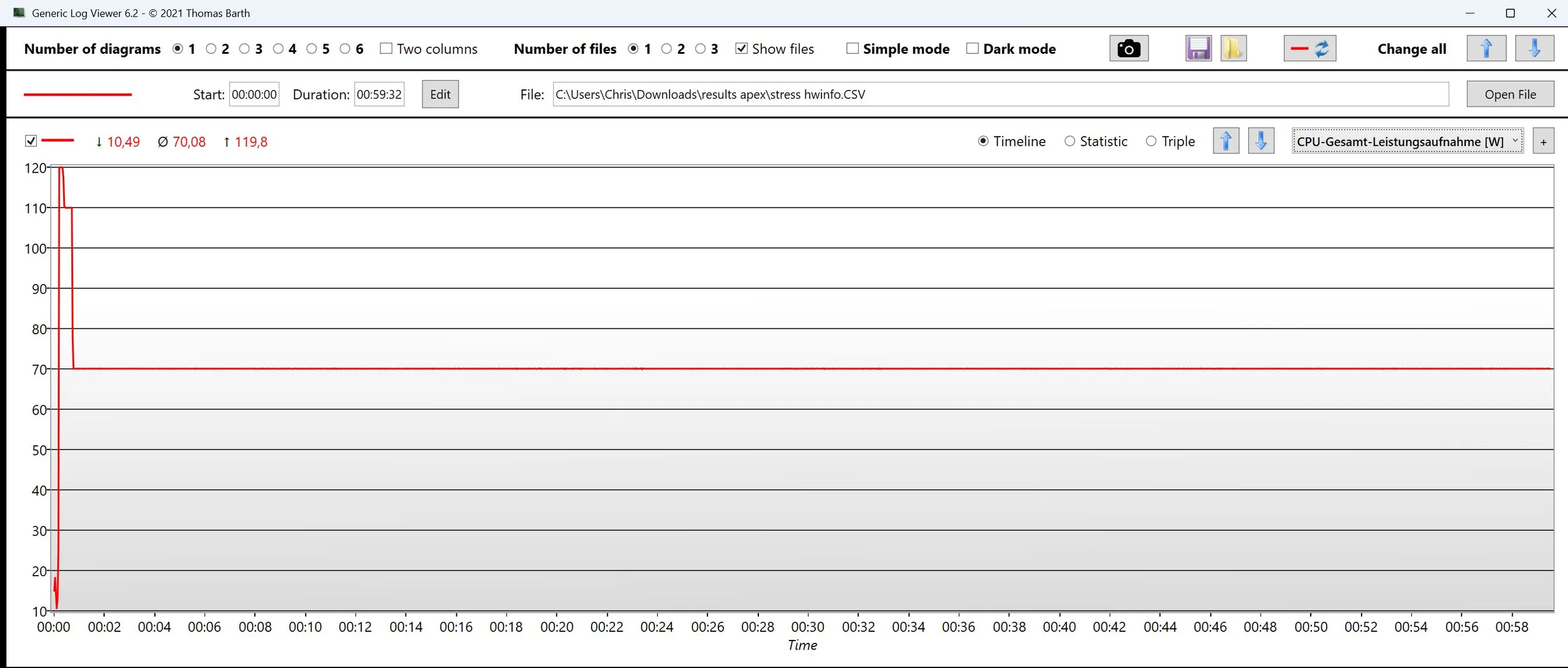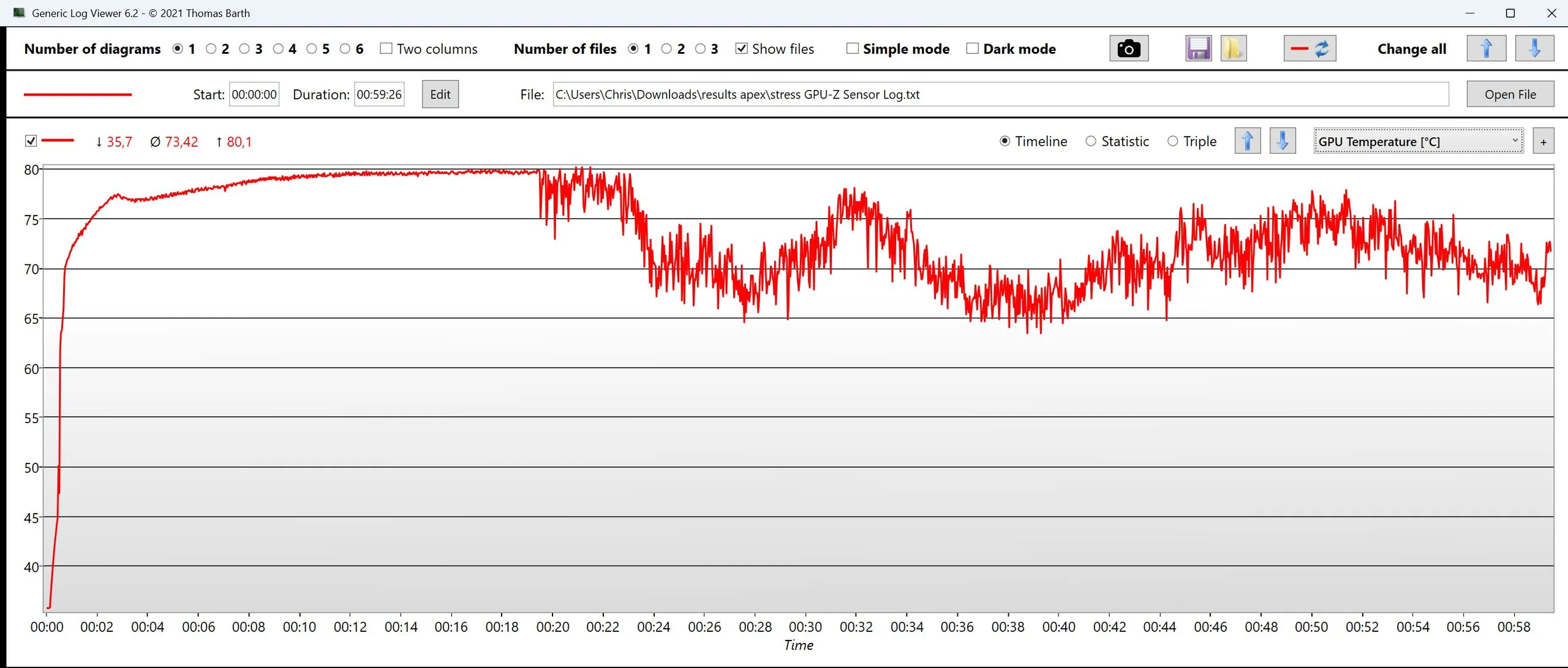 | CPU-klok (GHz) | GPU-klok (MHz) | Gemiddelde CPU-temperatuur (°C) | Gemiddelde GPU-temperatuur (°C) | |