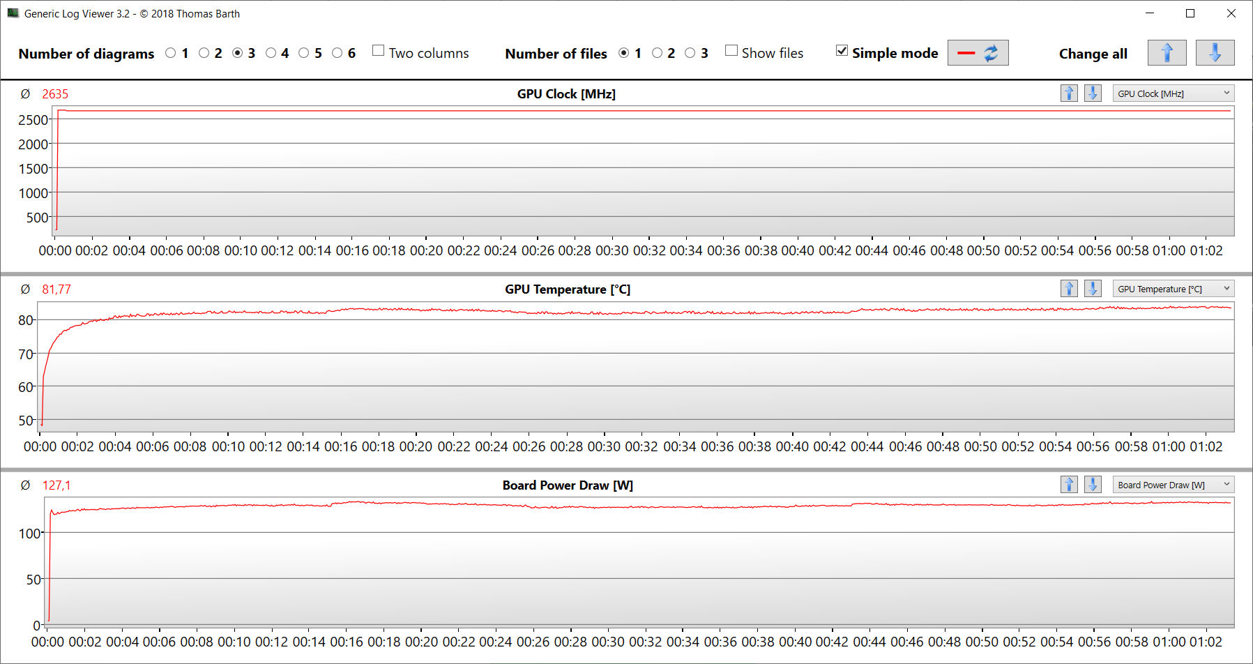 Het extreme scenario dat door de stresstest wordt gesimuleerd (Prime95 en Furmark in continu bedrijf) controleert de stabiliteit van het systeem onder volledige belasting. De CPU klok zakte langzaam en continu van waarden net boven de basiskloksnelheid naar waarden eronder. De grafische kern draaide de hele tijd op hoge snelheden.