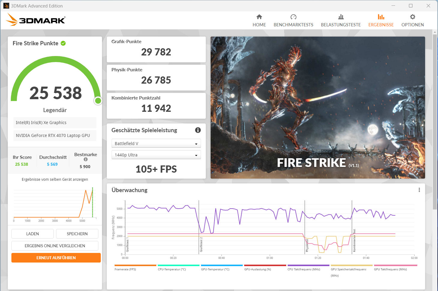 Video- en beeldbewerking, streamen, renderen en gamen behoren allemaal tot de expertise van de laptop. De vereiste kracht wordt geleverd door eenCore i9-13900Hen eenGeForce RTX 4070op een constant hoog niveau. Het is mogelijk om een goed compromis te vinden tussen prestaties en geluidsemissies.