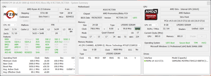 Asus ROG Xbox Ally X Ryzen Z2 Extreme, Radeon 890M, Samsung MZVMA1T0HCLD, IPS, 1920x1080, 7" | GPD Pocket 4 Ryzen AI 9 HX 370, Radeon 890M, , IPS, 2560x1600, 8.8" | Zotac ZGC-G1A1W-01 R7 8840U, Radeon 780M, Phison PS5021-E21 512GB, OLED, 1920x1080, 7" | MSI Claw 8 AI+ Core Ultra 7 258V, Arc 140V, Kioxia BG6 KBG60ZNS1T02, IPS, 1920x1200, 8" | Asus ROG Ally X Z1 Extreme, Radeon 780M, WD PC SN560 SDDPNQE-1T00, IPS, 1920x1080, 7" | Gemiddeld AMD Radeon 890M | Gemiddelde van klas Handheld / UMPC | |
