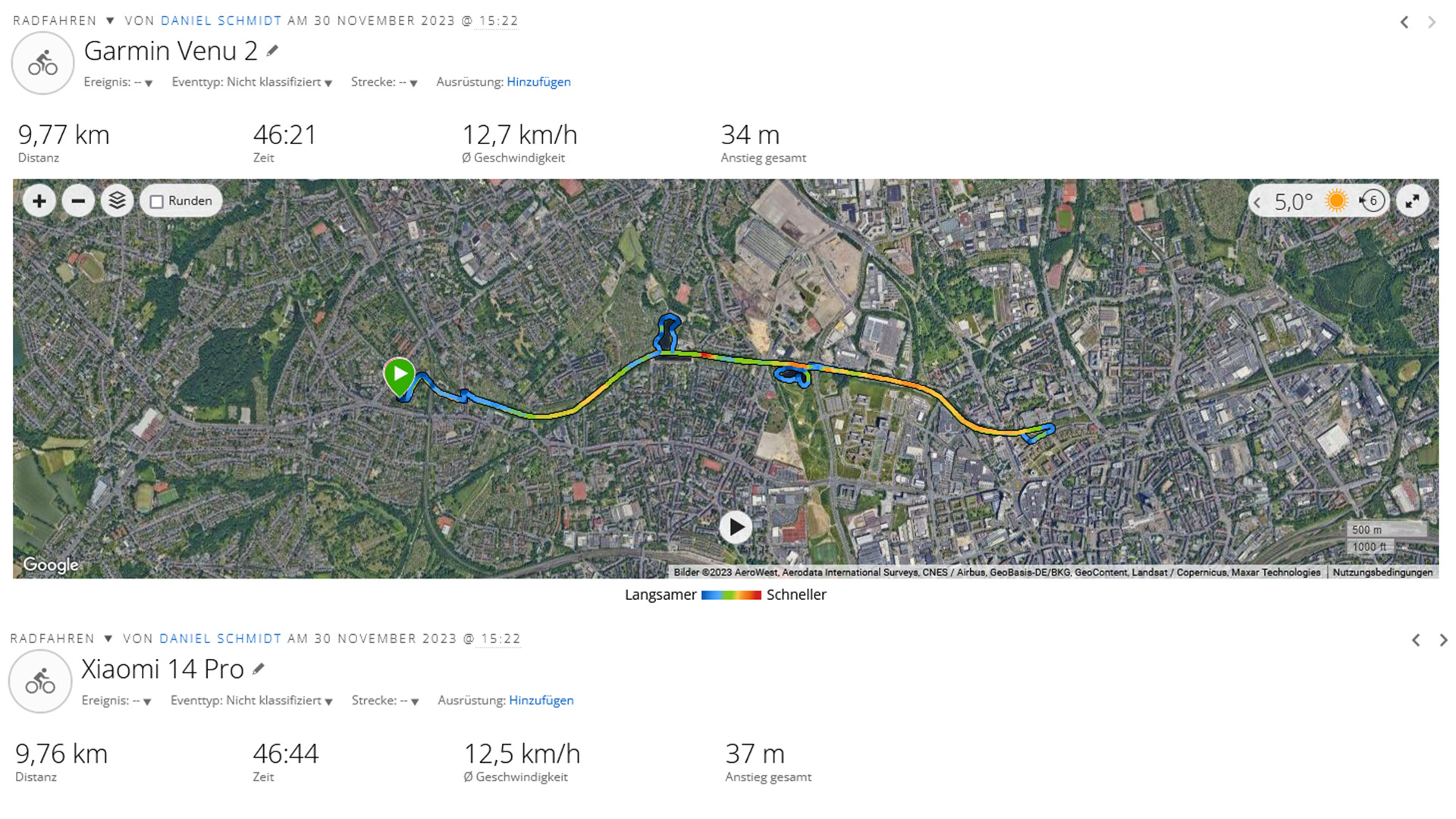 De 14 Pro bepaalt zijn locatie niet altijd perfect, en we zien enkele kleine afwijkingen van de werkelijke route, vooral in bochten. We gebruiken een Garmin Venu 2 ter vergelijking, maar de resultaten die deze levert lijken erg op die van de Xiaomi smartphone.