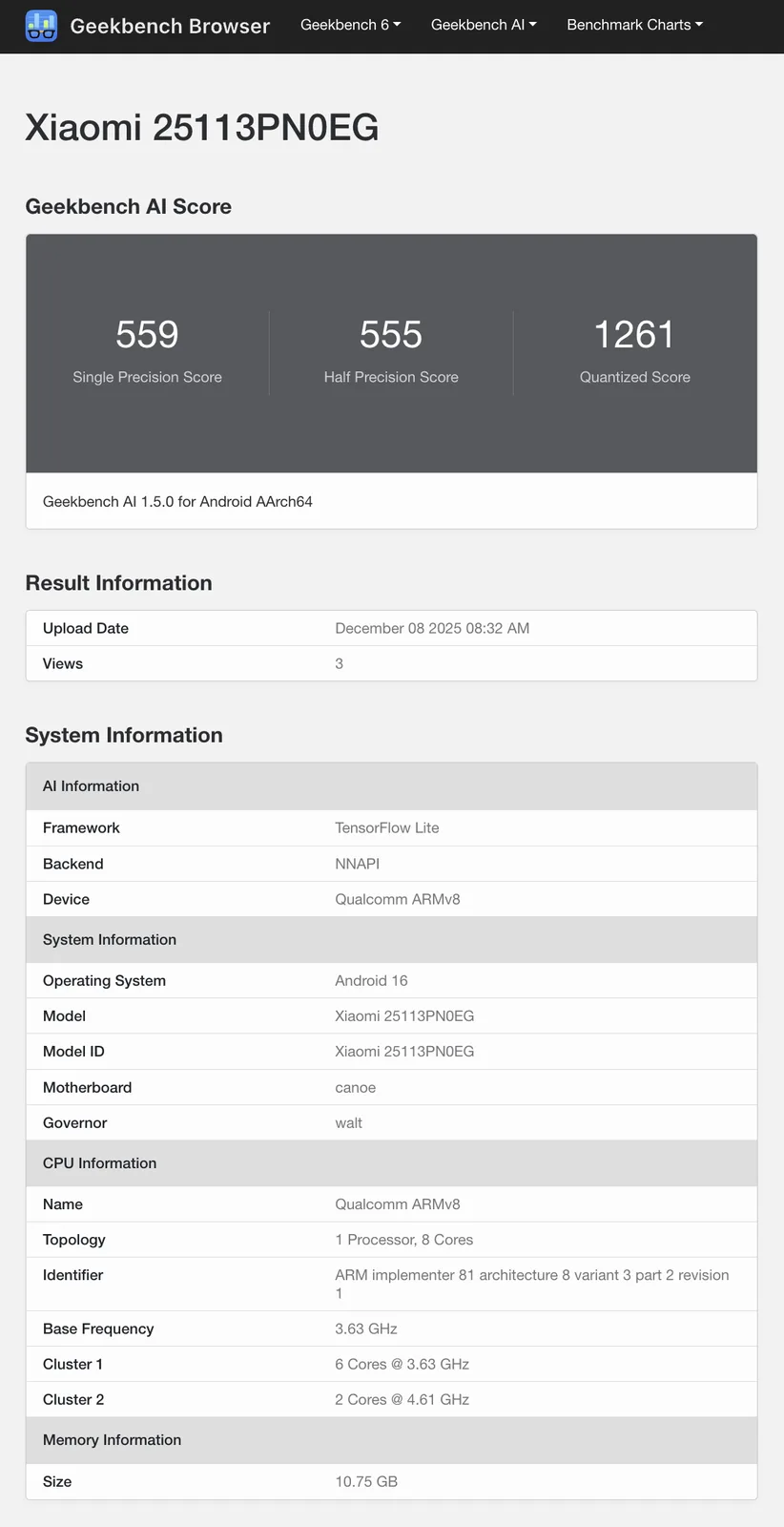 Xiaomi heeft de Xiaomi 17 gecertificeerd voor verkoop bij de National Broadcasting and Telecommunications Commission (NBTC) in Thailand. Uiteindelijk koppelt de NBTC alleen 25113PN0EG aan de Xiaomi 17. Dit wereldwijde modelnummer is echter tegelijkertijd op Geekbench verschenen. Uit deze vermelding kunnen we afleiden dat de wereldwijde Xiaomi 17 voorzien zal zijn van de reguliere Snapdragon 8 Elite Gen 5 chipset zal hebben, net als zijn Chinese tegenhanger. Niet alleen dat, maar de Xiaomi 17 zal internationaal ook starten met 12 GB RAM.