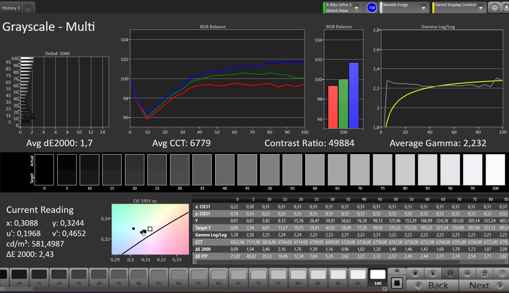 (±) | lineariteit van de middentonen is gemiddeld (7.3% delta ten opzichte van de vorige frequentie)