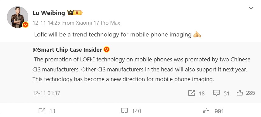In een reactie op op een Weibo-postbenadrukt Weibing dat de "Lateral Overflow Integration Capacitor"-technologie een trend zal worden voor smartphonecamera's, omdat deze ontworpen is om een hoog dynamisch bereik te leveren in één enkele belichting en tegelijkertijd ruis en LED-flikkering te voorkomen. De verklaring van de Xiaomi-voorzitter kan gezien worden als een bevestiging dat de nieuwe 1-inch Omnivision OV50X-sensor in de Xiaomi 17 Ultra gebruik maakt van Lofic.