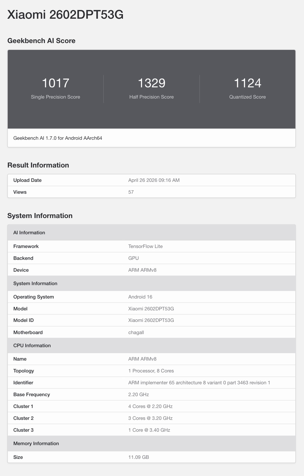 De Geekbench-vermelding onthult dat de Xiaomi 17T wordt aangedreven door de Dimensity 8500, een mid-range chipset die ook is gebruikt in de Poco X8 Pro. De notering geeft ook aan dat het apparaat 12GB RAM heeft en draait op Android 16. De Xiaomi 17T noteerde 1.017 punten in enkele precisie, 1.329 punten in halve precisie en 1.124 punten in de gekwantiseerde test op Geekbench AI.