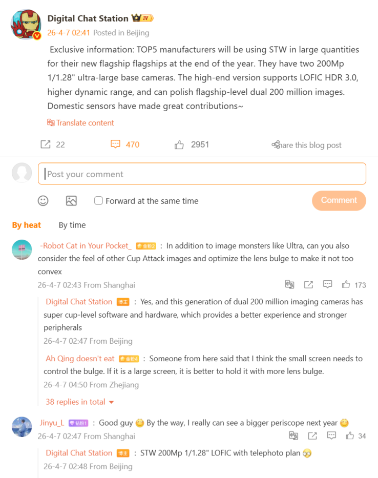 Verschillende van hen, waaronder blijkbaar Xiaomi, zullen naar verwachting tegen het einde van het jaar meer vertrouwen op dubbele-200 MP camerasystemen gebaseerd op 1/1.28-inch sensoren van de Chinese onderdelenmaker SmartSens, waarvan de high-end versie de derde generatie van LOFIC HDR zal ondersteunen voor een uitzonderlijk dynamisch bereik. Xiaomi gebruikt LOFIC al voor de 1-inch sensor in de Xiaomi 17 Ultra, en tegen het einde van 2026 zou de technologie ook gebruikt kunnen worden voor de telefoto-camera in een nieuwe versie, zoals wordt verduidelijkt in de opmerkingen op Weibo.