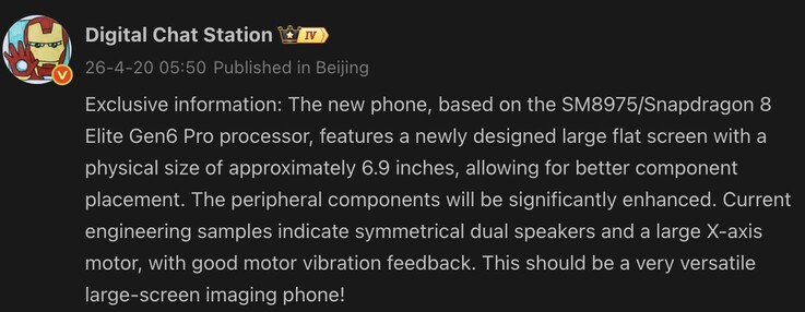 Verder geeft het lek aan dat het apparaat een 6,9-inch plat scherm zal gebruiken. Het kan ook voorzien zijn van symmetrische dubbele luidsprekers en een grote lineaire X-as motor voor haptische feedback. De tipgever zinspeelt ook op een verbeterde ultragroothoeklens. Eerdere lekken suggereren een 200MP primaire camera en een 200MP periscoop telezoomcamera.
