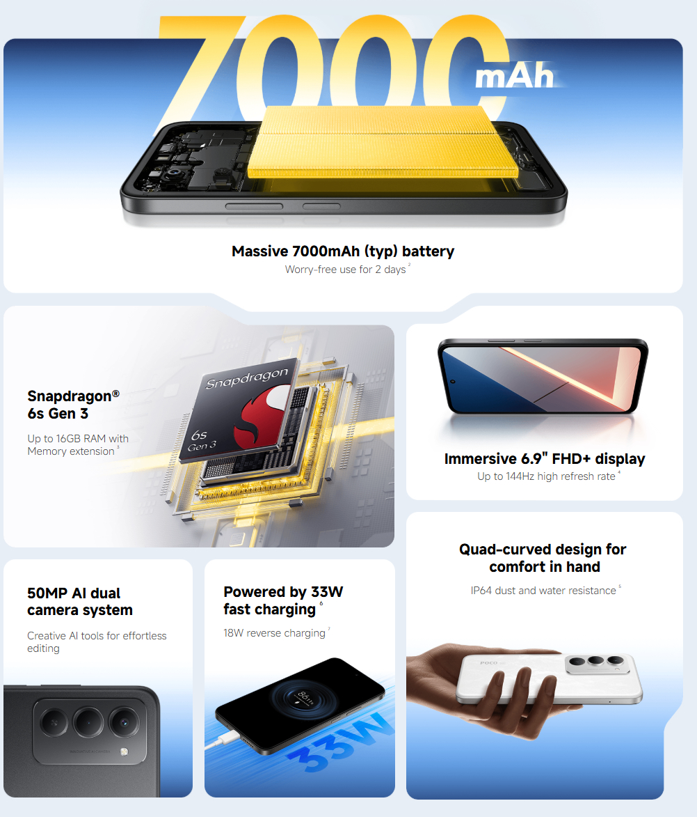 Kortom, de Poco M8s is een opnieuw gemerkte Redmi 15 (momenteel $199 op Amazon). Als gevolg hiervan beschikt de nieuwe smartphone ook over een Snapdragon 6s Gen 3 chipset, een 7.000 mAh batterij en een 50 MP primaire camera. De Poco M8s heeft ook een verversingssnelheid van 144 Hz op zijn 1080p scherm en ondersteuning voor 33 W bedraad opladen voor zijn grote batterij.