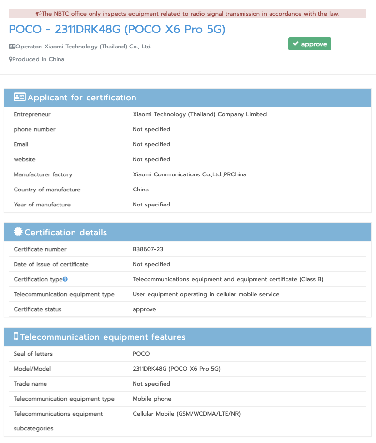 Verschillende bronnen hebben nu een nieuwe verwijzing ontdekt naar de 2311DRK48G, een aanstaand toestel dat Xiaomi van plan is wereldwijd te verkopen. Volgens de National Broadcasting and Telecommunications Commission (NBTC) van Thailand heeft 2311DRK48G betrekking op de POCO X6 Pro 5G, een model dat als duurder alternatief voor de POCO X6 5G op de markt zal komen. Gebaseerd op recente geruchtenzou de laatstgenoemde een rebranded Redmi Note 13 Pro die Xiaomi sinds eind september in China verkoopt.